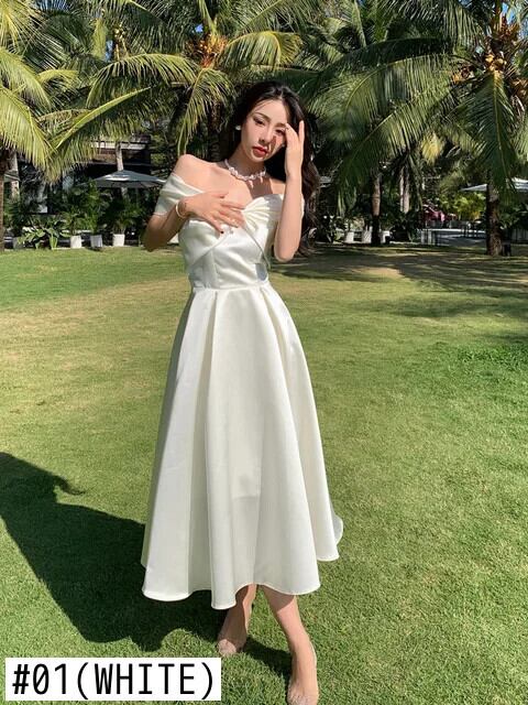 送料無料 ヴィンテージホワイトスラッシュネックボウドレス女性パーティー A ラインミディドレスイブニング結婚式の服 Vestdios 夏 リボン サマー 夏物 Aライン ビンテージ AE008878782180841995
