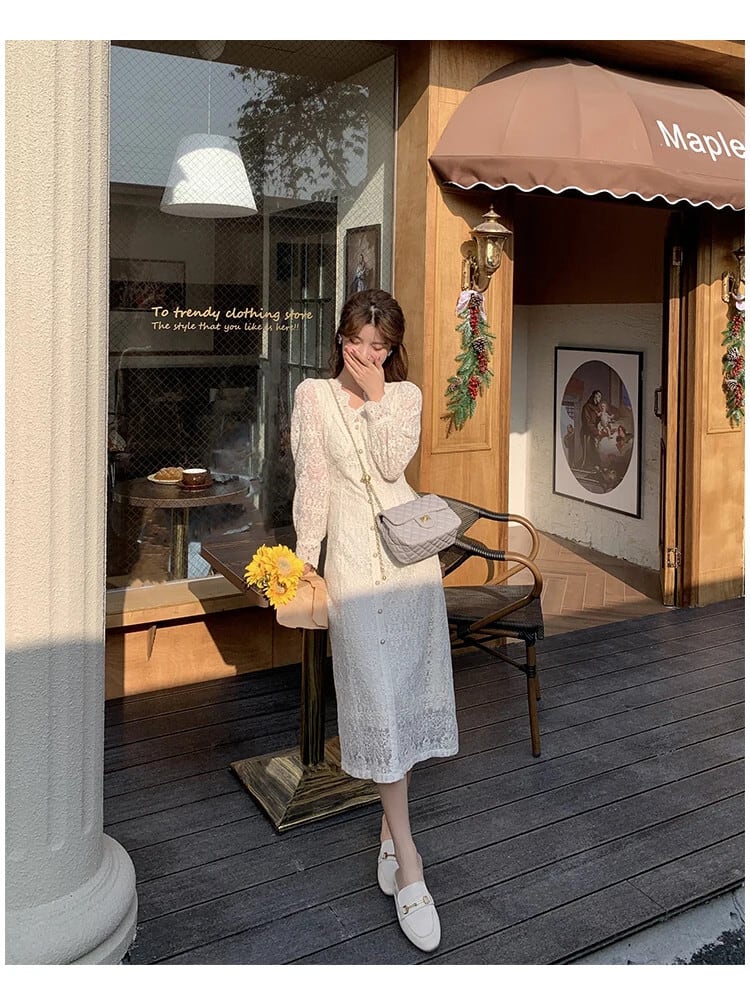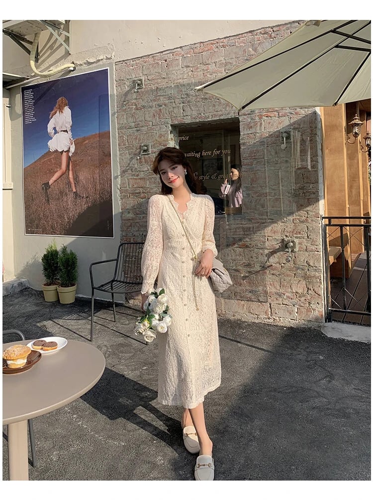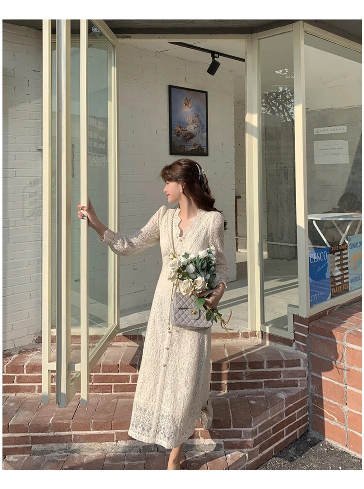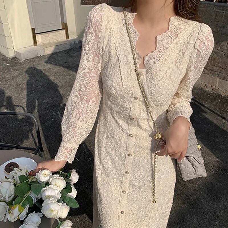 送料無料 レース長袖ミディドレス冬白人女性 V ネックドレス春ワンピースイブニングレディパーティー妖精ドレス 2021 ロング ホワイト スプリング 春物 ウィンター 冬物 Vネック AE008878739607473939