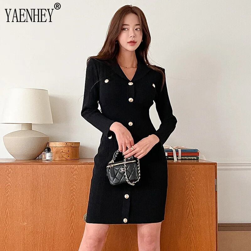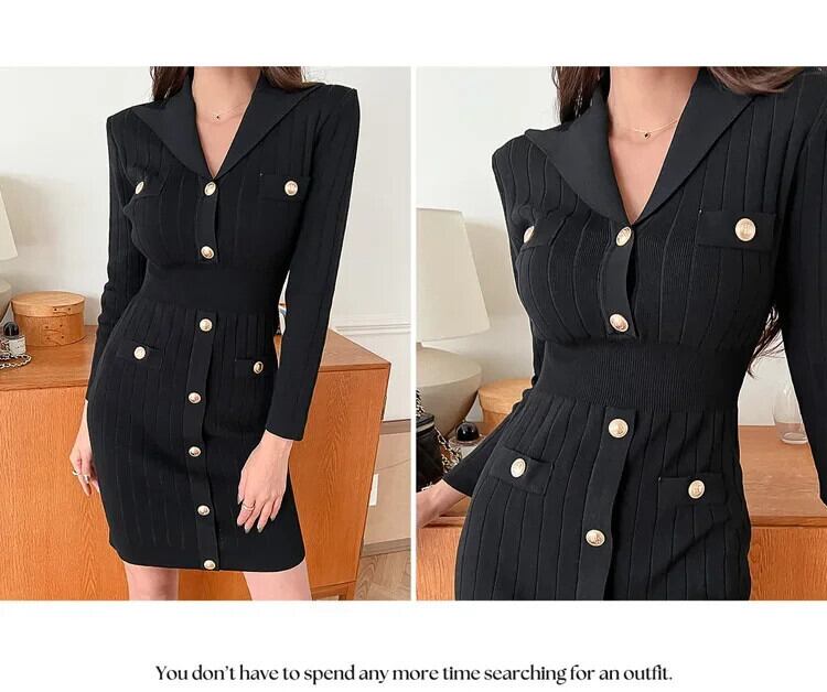 送料無料 黒ニットボディコンミニドレス女性のセクシーな V ネックスリム長袖ボタンラップヒップショートドレスシックな秋 2023 ロング ブラック オータム 秋物 Vネック AE008878785045643966