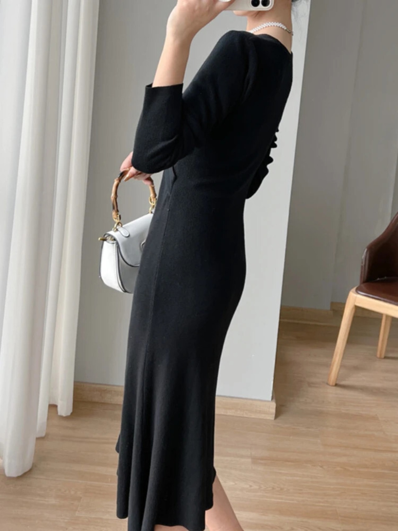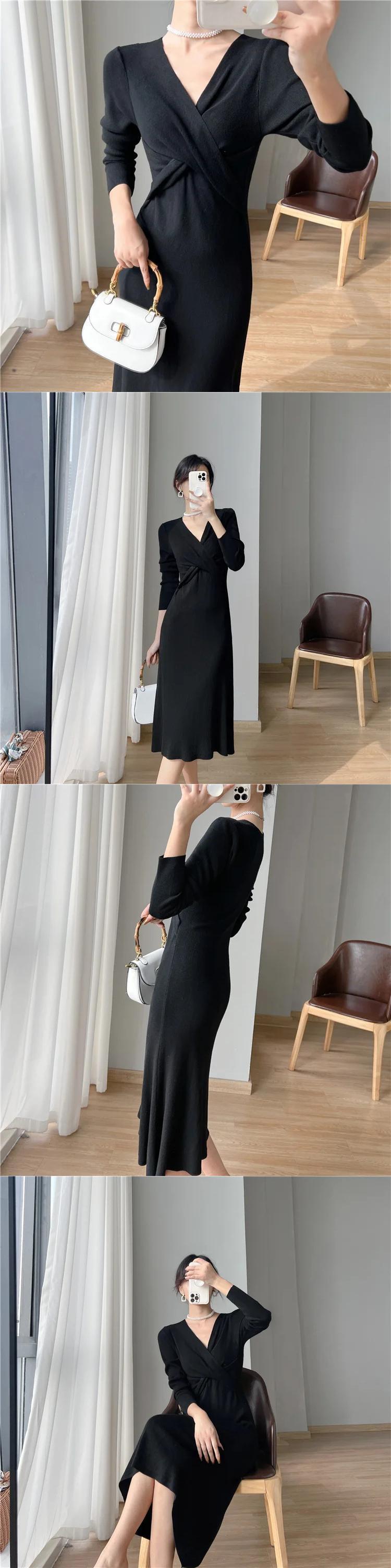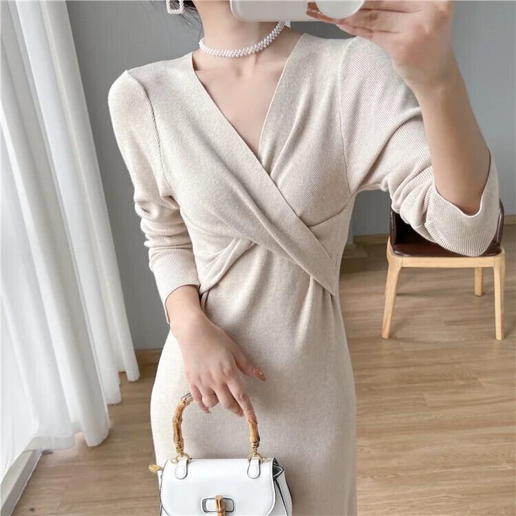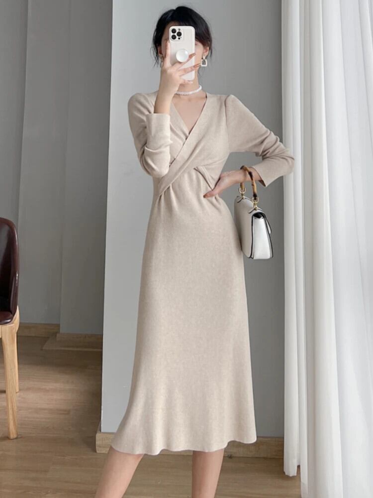送料無料 ヴィンテージ V ネックニットセータードレス女性長袖オフィスレディスリムパーティードレス Vestidos 秋冬 2023 ロング オータム 秋物 ウィンター 冬物 Vネック ビンテージ 会社 学校 通勤や通学にも AE008878781988939804