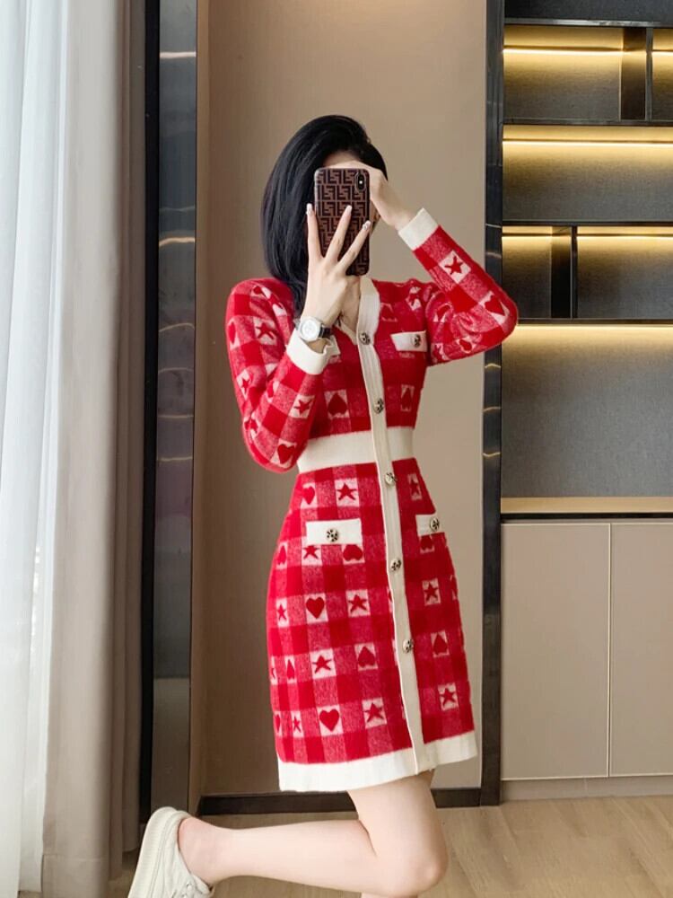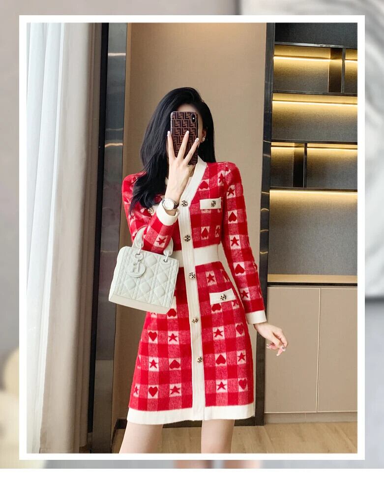 送料無料 ヴィンテージ V ネック長袖ウェディングマキシドレス女性パーティーチェック柄ニットボディコンドレスレッド冬 2022 クリスマス ロング ウィンター 冬物 Vネック ビンテージ AE008878730348712639