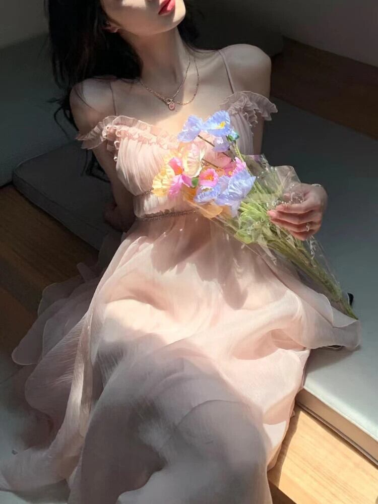 送料無料 原宿フレンチスイート V ネックキャミソールノースリーブセクシーなストラップミディマキシドレス女性妖精パーティー夏ピンク 大人ガーリー スウィート キュート カジュアル かわいい サマー 夏物 Vネック AE008878726890300306