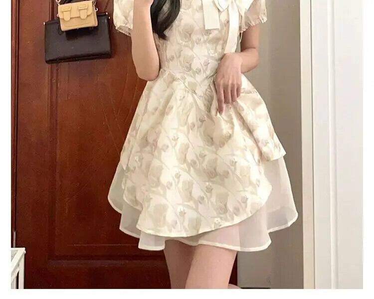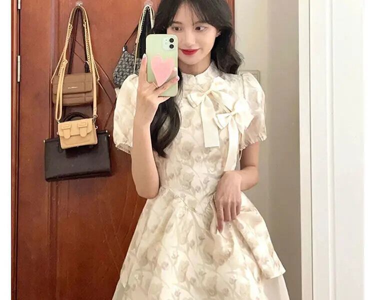 送料無料 ヴィンテージかわいい弓花柄ミニドレス女性 Vestidos プレッピーパッチワーク Y2k 甘いパフスリーブボディコンドレス夏 2023 リボン 大人ガーリー スウィート キュート カジュアル サマー 夏物 ビンテージ AE008878747097135510