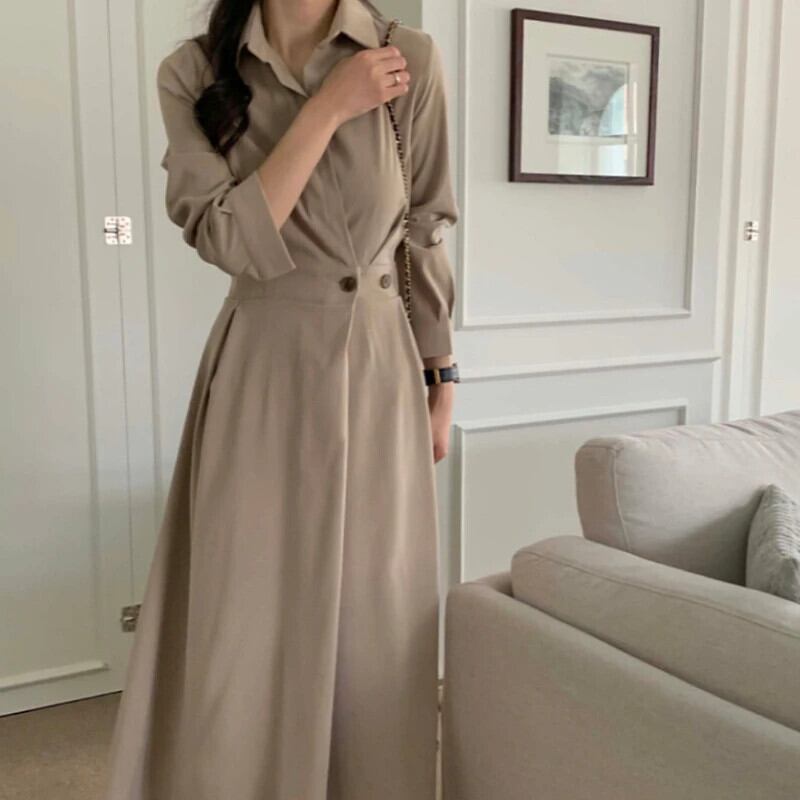 送料無料 ヴィンテージシックなターンダウン襟 A ラインボディコンドレス女性長袖スリムドレス Vestidos ブラック ロング Aライン ビンテージ AE008878755435456733