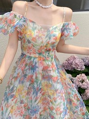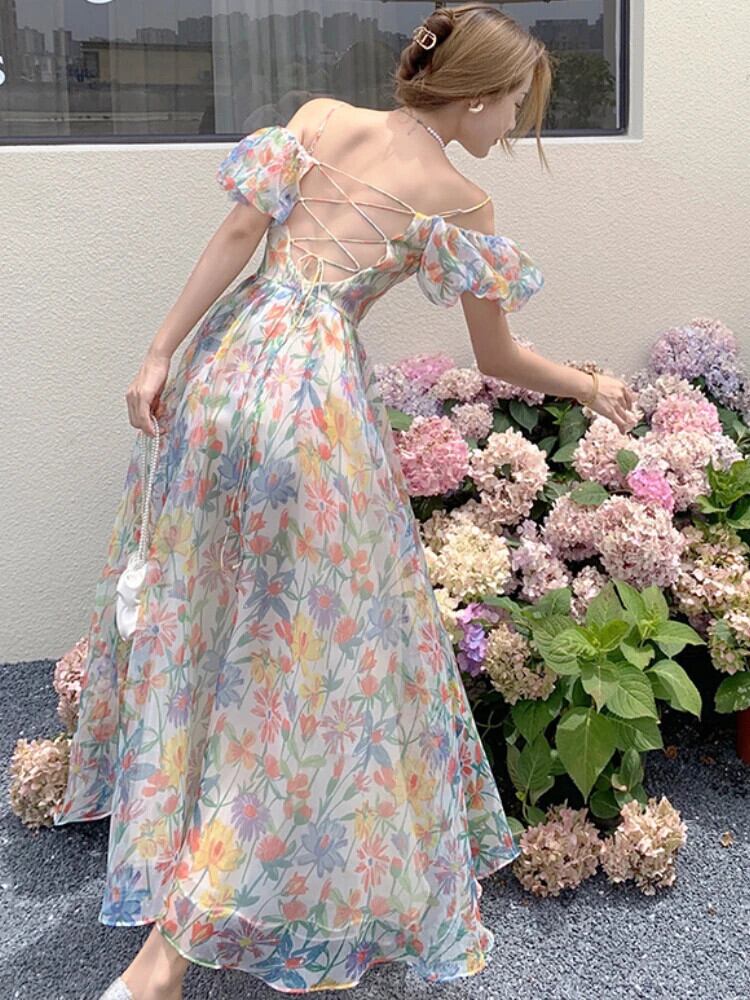 送料無料 ヴィンテージ印刷花パーティーマキシドレス女性スラッシュネックパフスリーブセクシーな背中の開いたミディドレスフランス夏 2022 サマー 夏物 花柄 ビンテージ AE008878794444081491