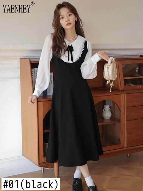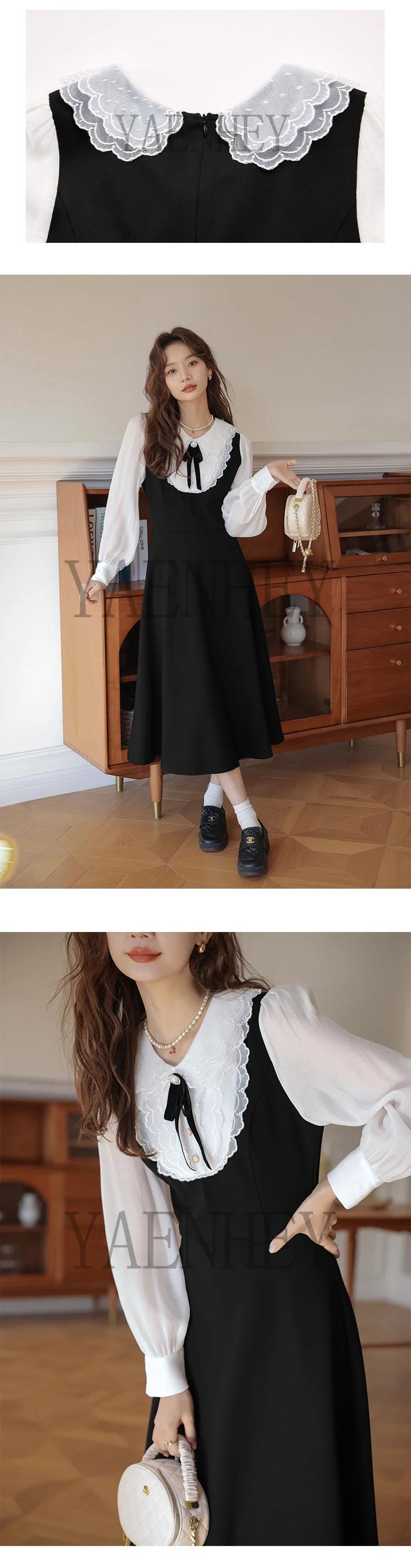 送料無料 ヴィンテージピーターパン襟パッチワークニットセーター黒ボディコンドレス女性長袖ミディドレス秋 2023 ロング ブラック オータム 秋物 ビンテージ AE008878745269703968