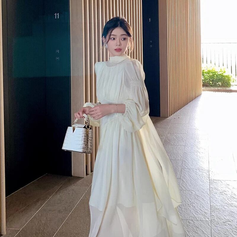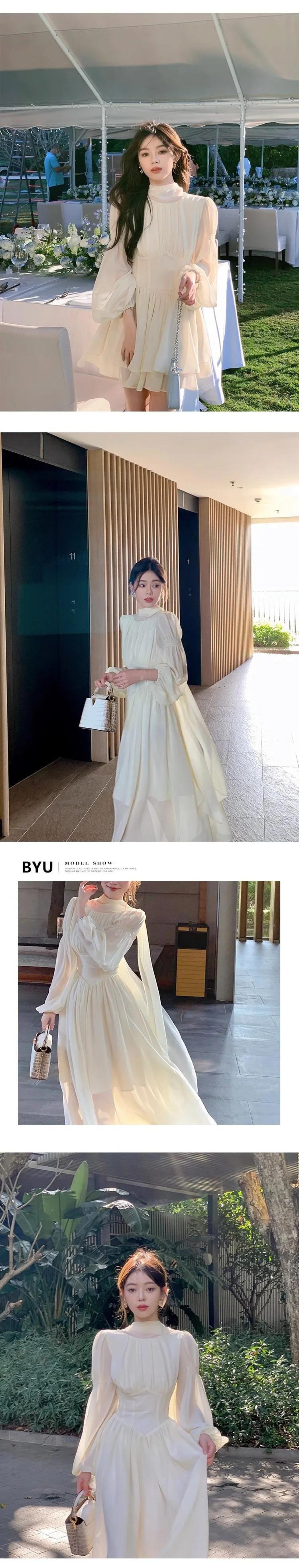 送料無料 フレンチホワイトシフォンマキシドレス女性スリーブスリムパフスリーブボディコンドレス優しい妖精ショートドレス夏 2023 サマー 夏物 AE008878714581343736