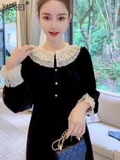 送料無料 O ネックフレアスリーブプリーツパッチワークブラックベルベットミディドレスローブイブニングマキシドレス女性秋 2023 オータム 秋物 Oネック AE008878719451029065