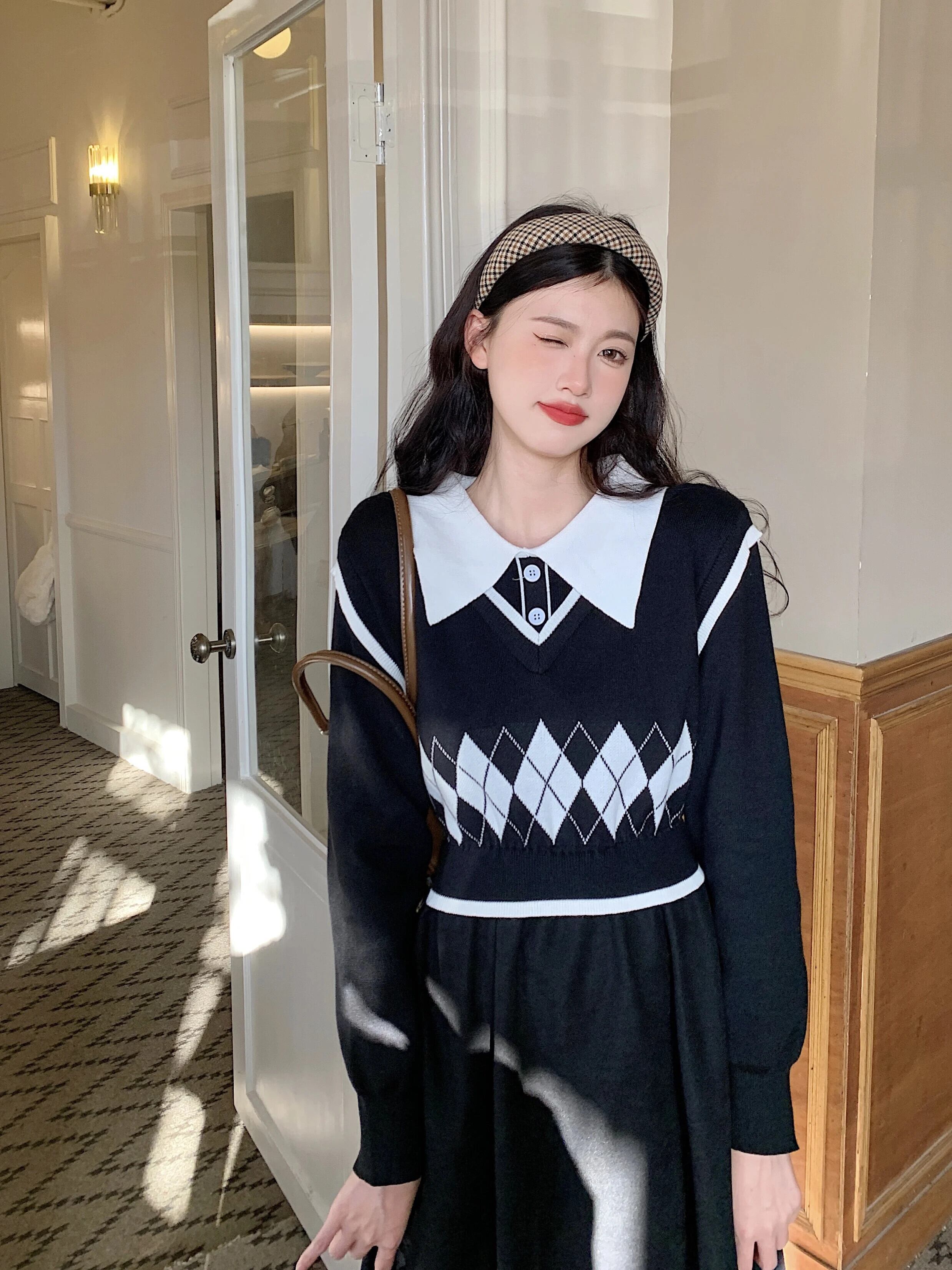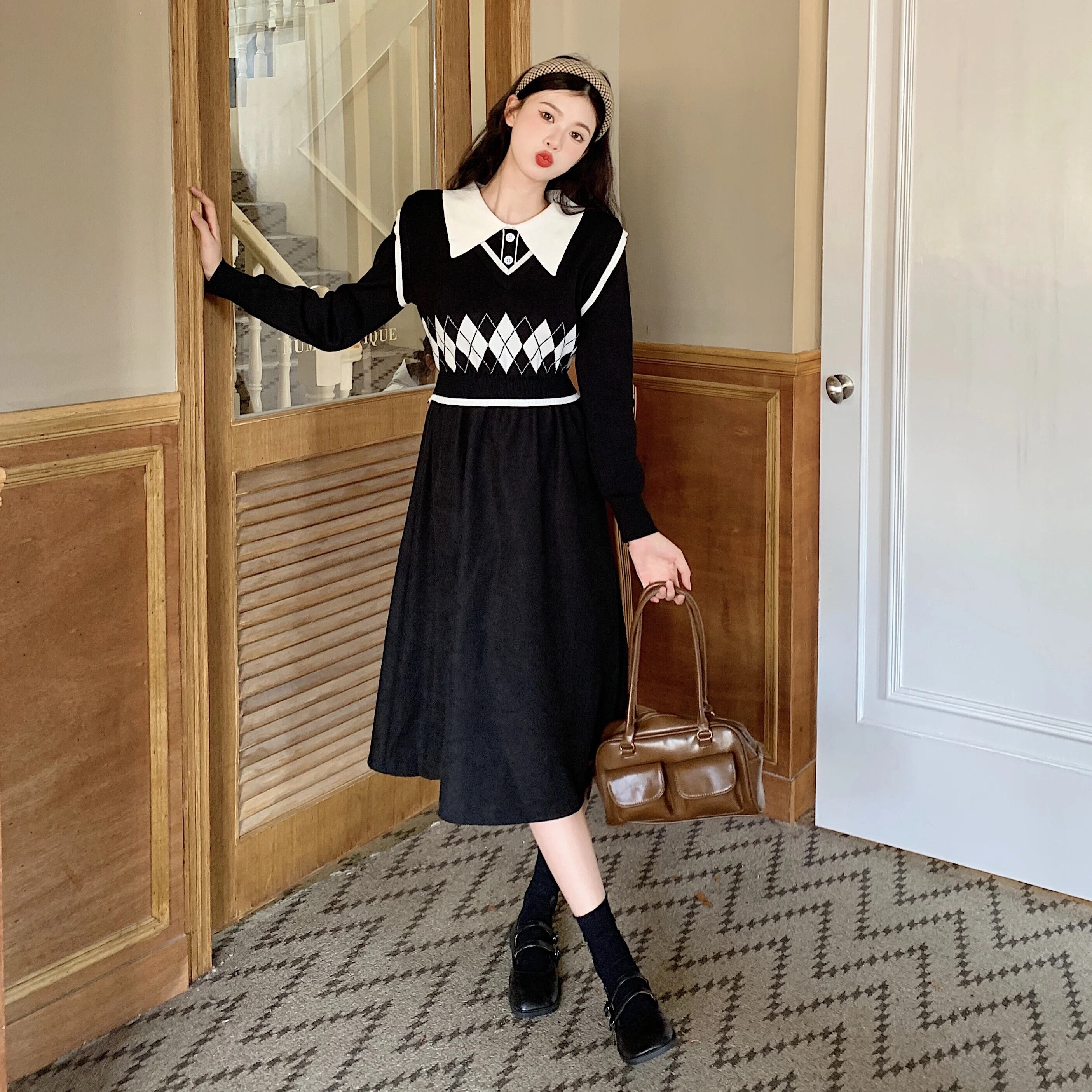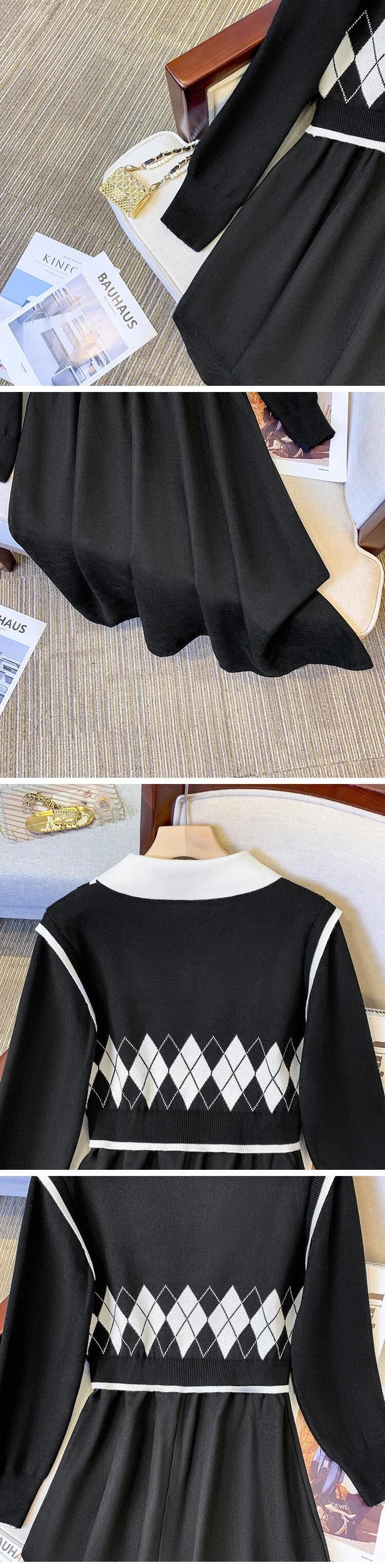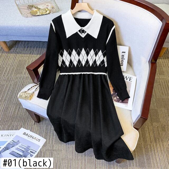 送料無料 ヴィンテージニットイブニングドレス女性ピーターパン襟パッチワーク偽 2 ピースドレス e 秋冬 2023 オータム 秋物 ウィンター 冬物 ビンテージ AE008878774327765023