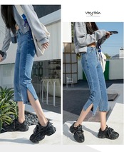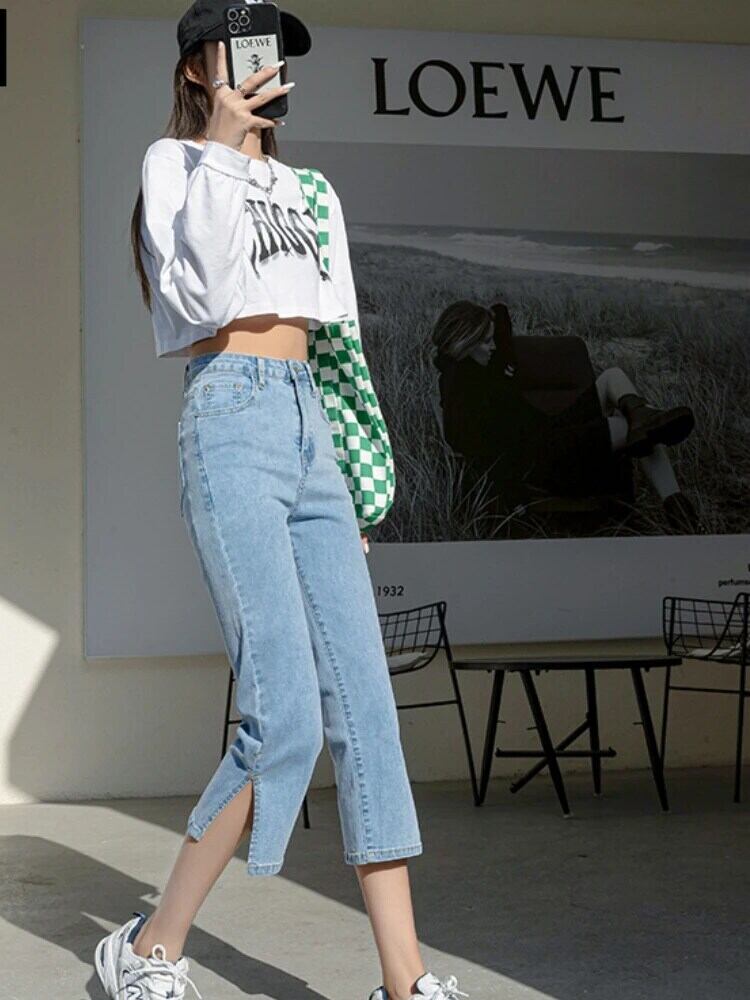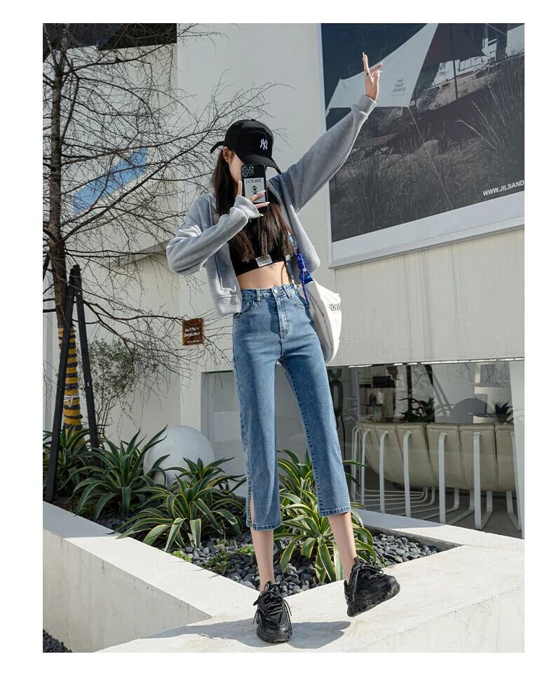 送料無料 固体ジーンズ女性ストレートスリムデニムスタイルサイドスリット足首丈トレンディなオールマッチボトムシックなボーイフレンド ソリッドカラー AE008878776851243951