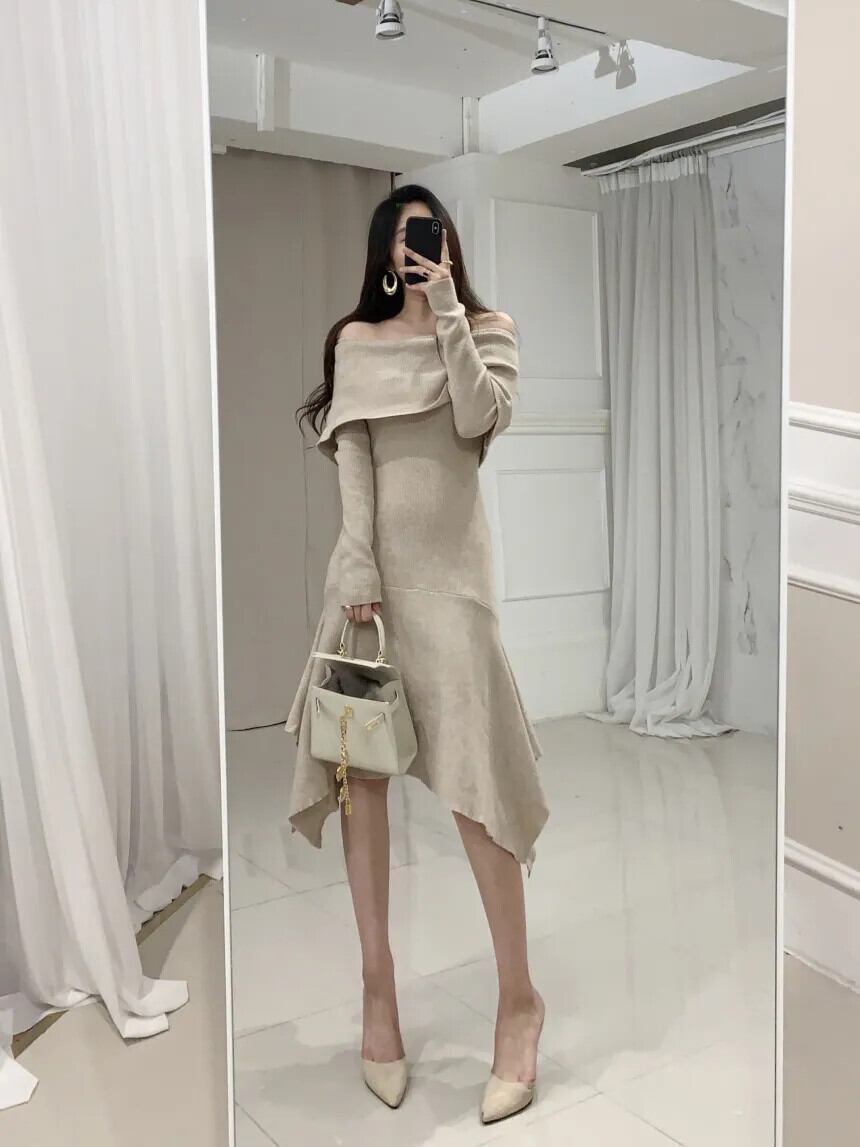 送料無料 ヴィンテージセクシーなスラッシュネック長袖フリル裾ロングセータードレス女性スリムウエスト不規則な弾性ニットドレス冬 2022 エラスティック 伸縮 ウィンター 冬物 ビンテージ AE008878726788009255