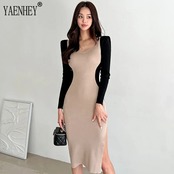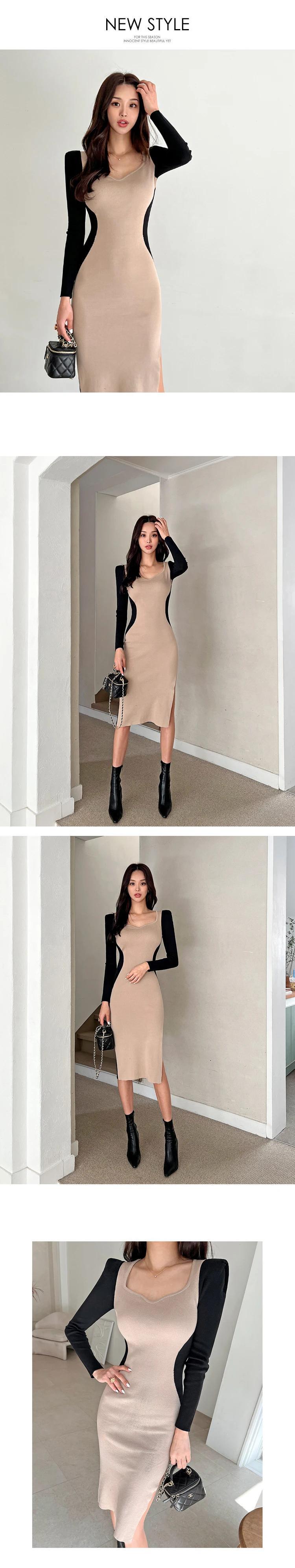 送料無料 ヴィンテージニットペンシルドレスレディースシンプルなボディコンパッチワークオフィスドレスパーティー Vestido 秋 2023 オータム 秋物 ビンテージ 会社 学校 通勤や通学にも AE008878782222550308