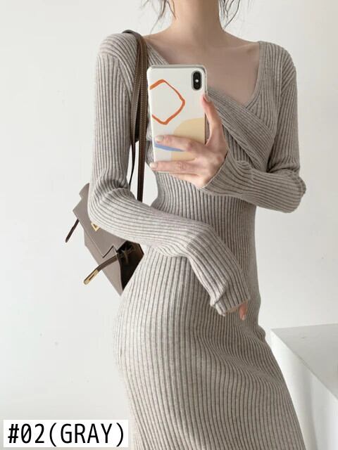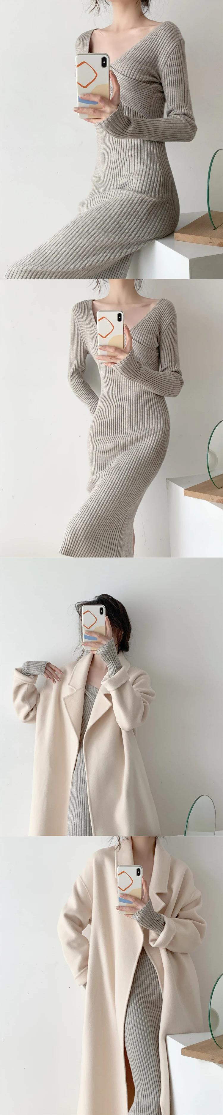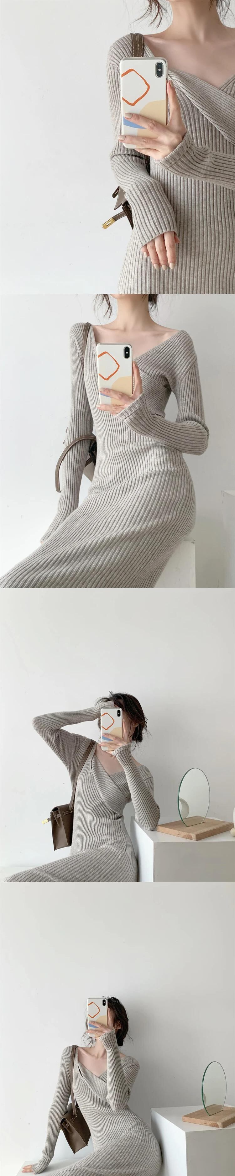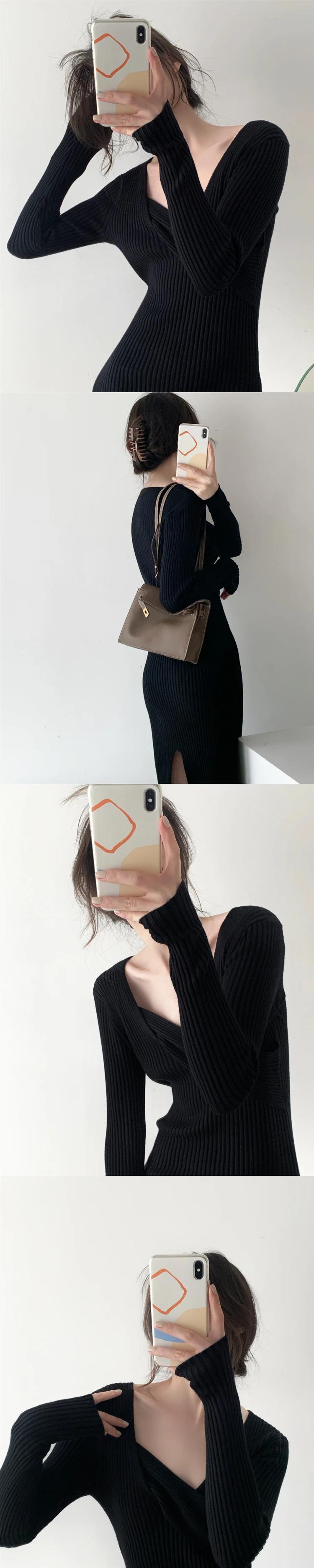 送料無料 ヴィンテージスタイルのセクシーなニットボディコンドレス女性秋冬 2023 ストリートスリム V ネック長袖セーターロングドレス オータム 秋物 ウィンター 冬物 Vネック ビンテージ AE008878722057088406