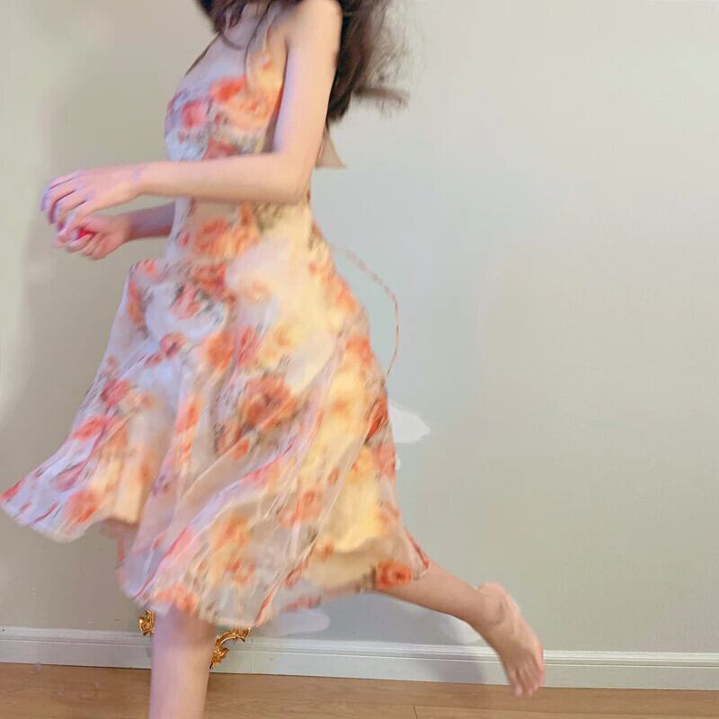 送料無料 ヴィンテージフレンチセクシーなマキシドレス背中の開いた花ホルターネックオーガンザホリデービーチミディドレス女性パーティー夏 サマー 夏物 花柄 ビンテージ AE008878718726264838
