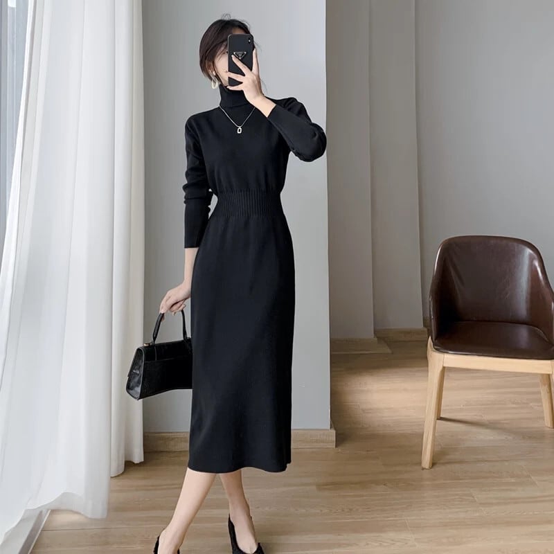 送料無料 タートルネック長袖セーター Kintted ミディドレス女性スリムプルオーバーニットボディコンロングドレス暖かいローブ秋冬 2023 オータム 秋物 ウィンター 冬物 AE008878769723568948