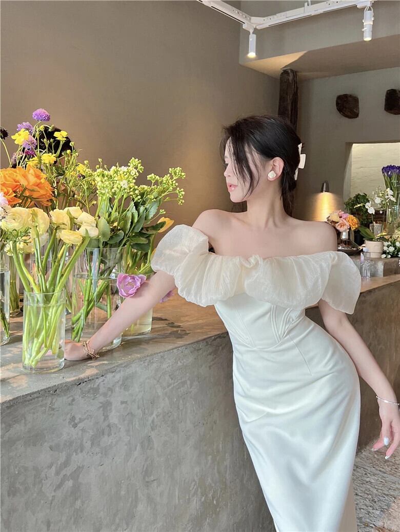 送料無料 Vinatge セクシーなイブニングマキシウェディングドレス女性ウエディングスラッシュネックパフスリーブボディコンミディドレスサマーローブ 夏物 AE008878758607273568
