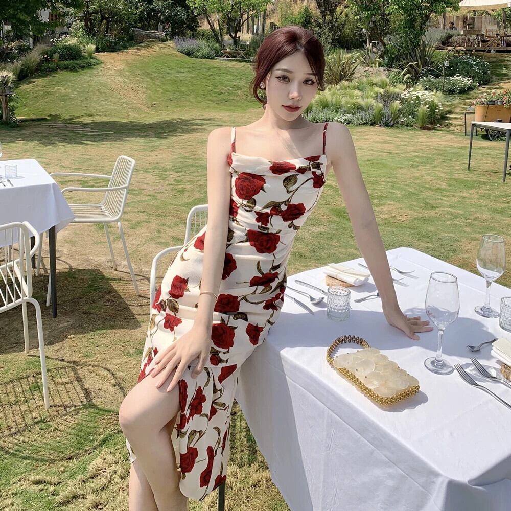 送料無料 ヴィンテージスラッシュネックスパゲッティストラップローズ花シフォンミディドレス女性パーティーボディコンビーチローブ Vestidos 夏 サマー 夏物 花柄 ビンテージ AE00887875019034795