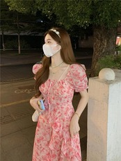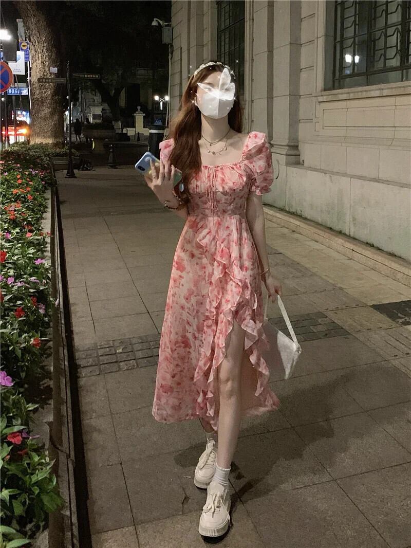 送料無料 ヴィンテージパフスリーブ不規則なプリントドレス女性フリルパーティー花柄ロングドレス夏 2023 サマー 夏物 ビンテージ AE008878790166778288