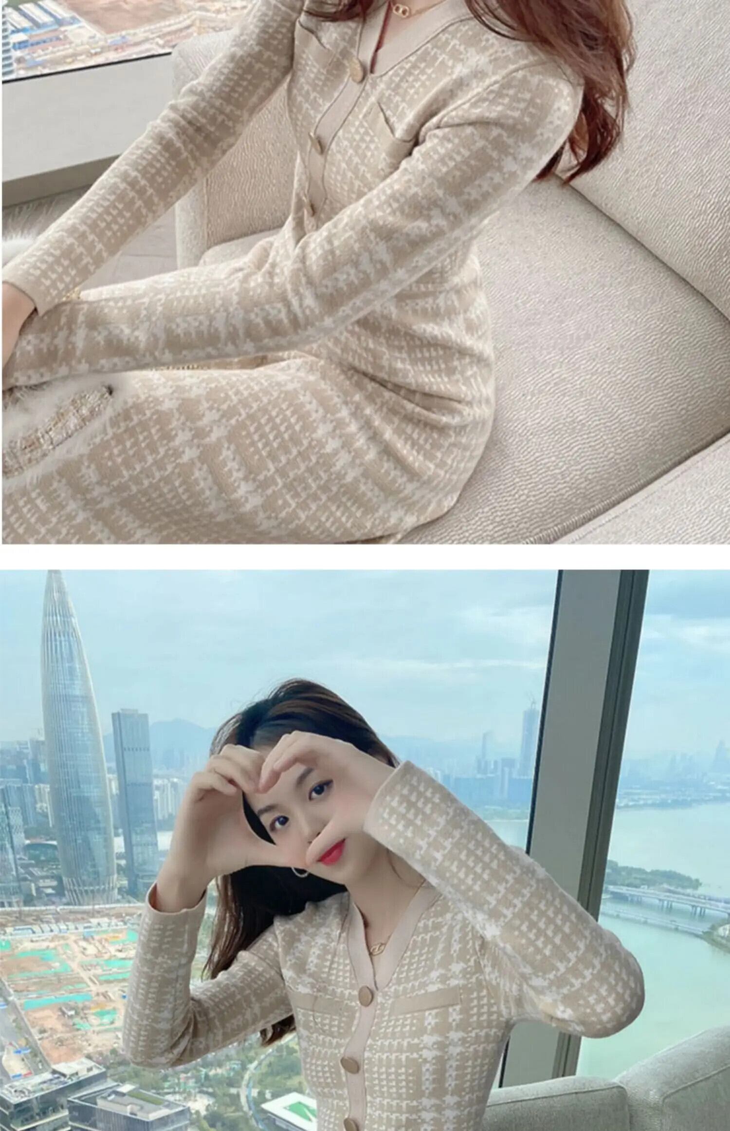送料無料 ヴィンテージボタンチェック柄セクシーなセーターの女性のドレスイブニング長袖 V ネックマキシドレス女性パーティー秋 2022 ロング オータム 秋物 Vネック ビンテージ AE008878712104093347