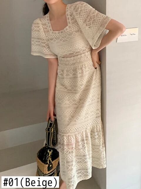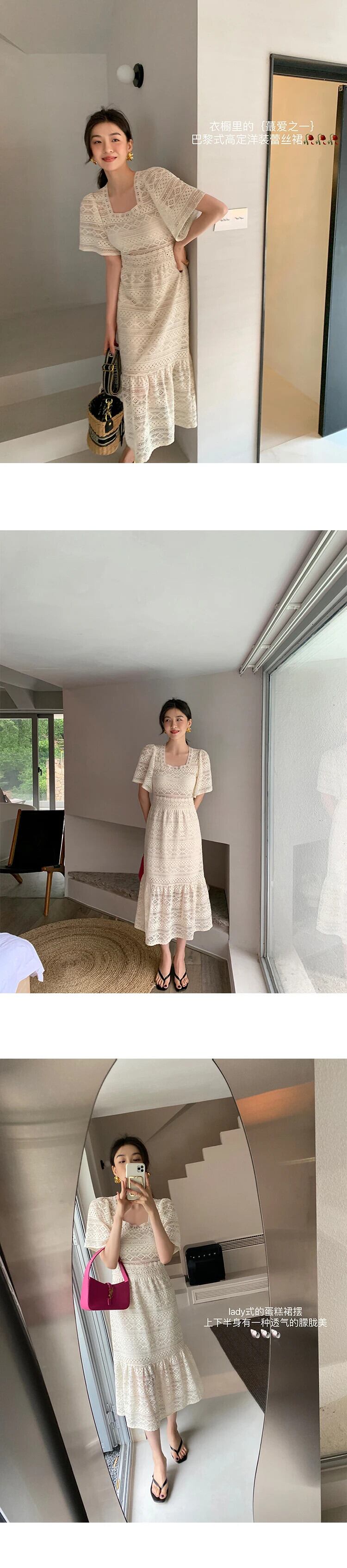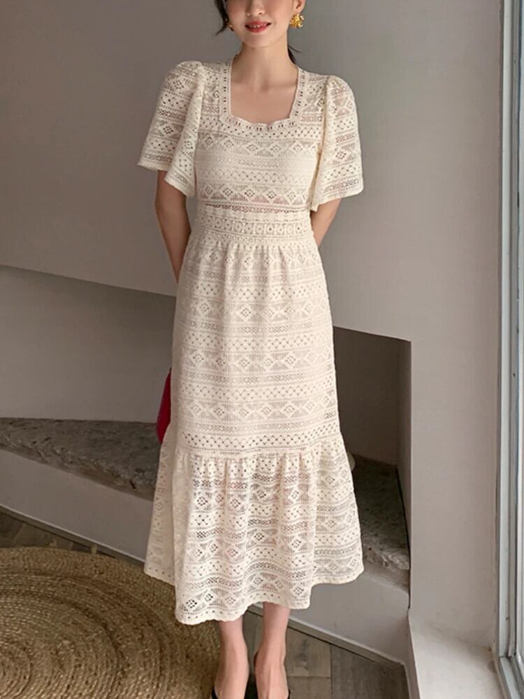 送料無料 甘いソフトガールスクエアカラー A ラインミディドレス夏のレース刺繍パーティードレスオフィスレディ Vestidos Feminino 大人ガーリー スウィート キュート カジュアル サマー 夏物 Aライン スクウェア 会社 学校 通勤や通学にも AE008878740340253150