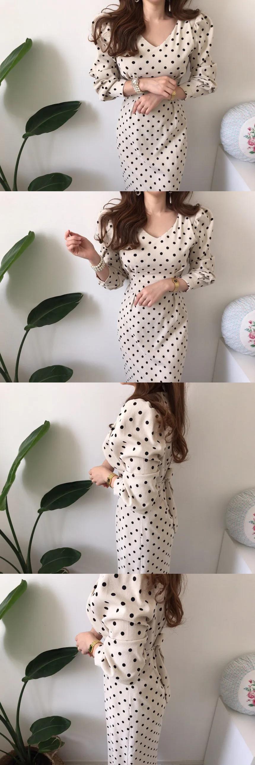 送料無料 ヴィンテージ水玉コーデュロイドレス長袖ミディドレス女性 V ネックスリム Vestidos 秋 2022 ロング オータム 秋物 Vネック ビンテージ AE008878717859323901