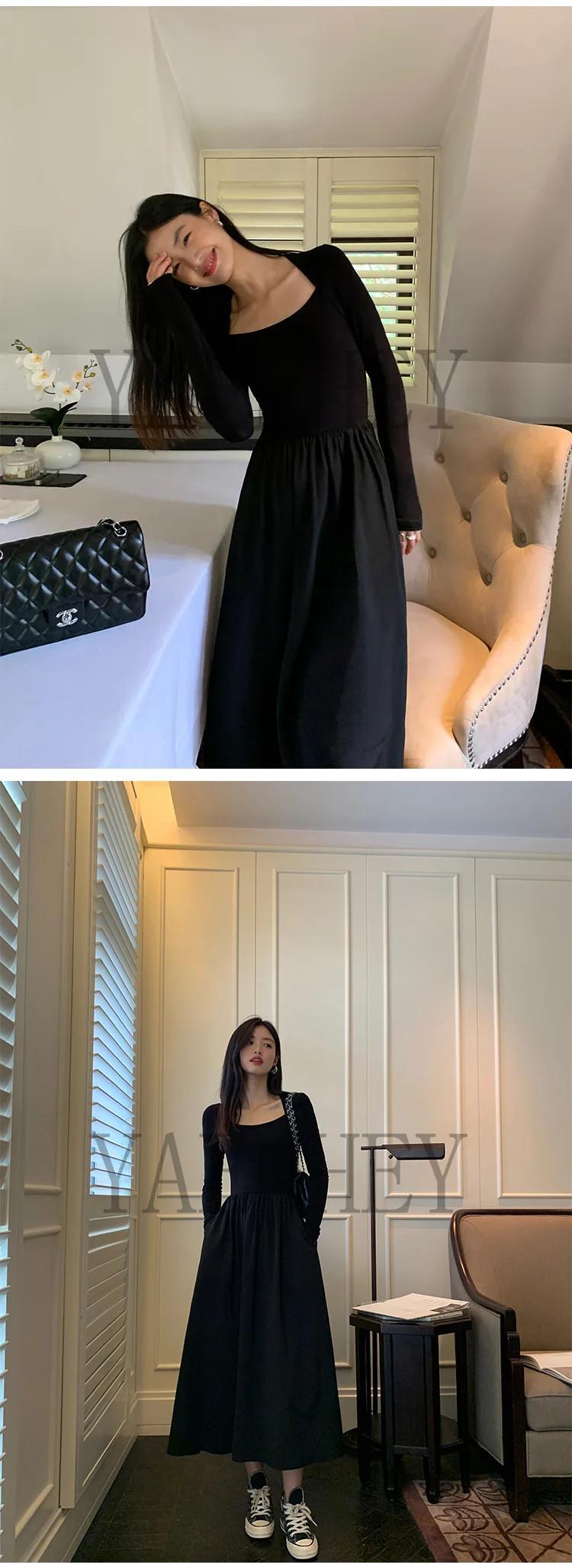 送料無料 ヴィンテージスクエアカラーマキシウェディングドレス女性パーティーオフィスレディブラックポケットボディコンミディドレス秋 オータム 秋物 スクウェア ビンテージ 会社 学校 通勤や通学にも AE00887879455096749