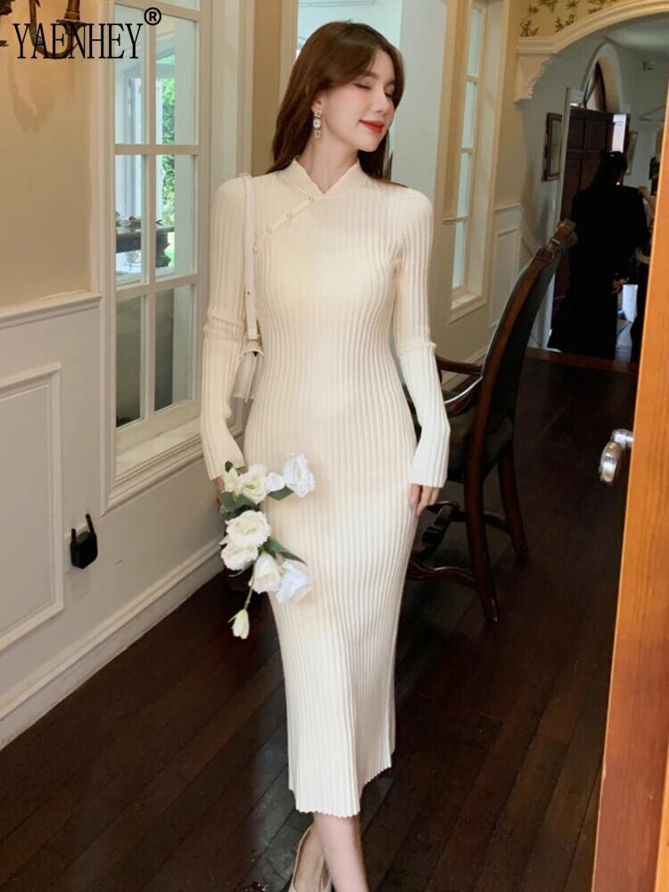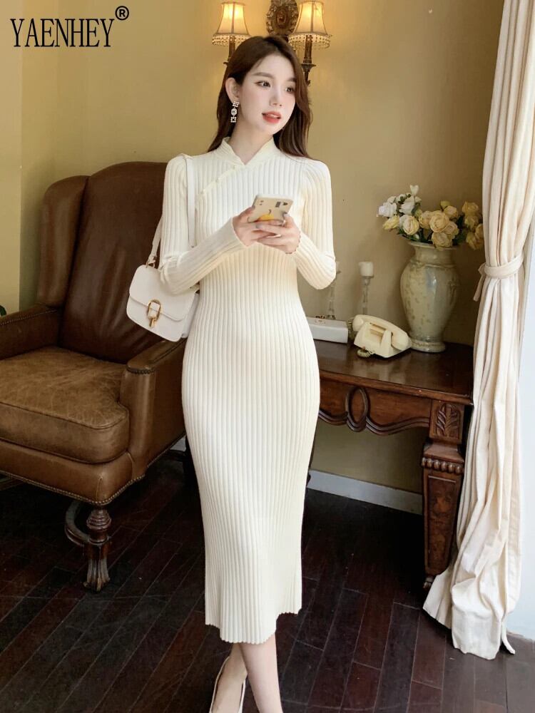 送料無料 中国風スタンドカラーニットセーターミディドレス女性ヴィンテージボディコンドレス秋冬 オータム 秋物 ウィンター 冬物 ビンテージ AE008878748162197842