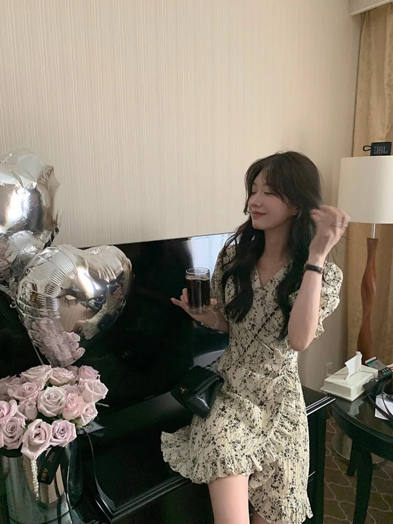 送料無料 ヴィンテージ V ネックプリントバタフライスリーブミニドレス女性パーティーストリートスリムボディコンドレス夏 2023 サマー 夏物 Vネック ビンテージ AE008878733629511059