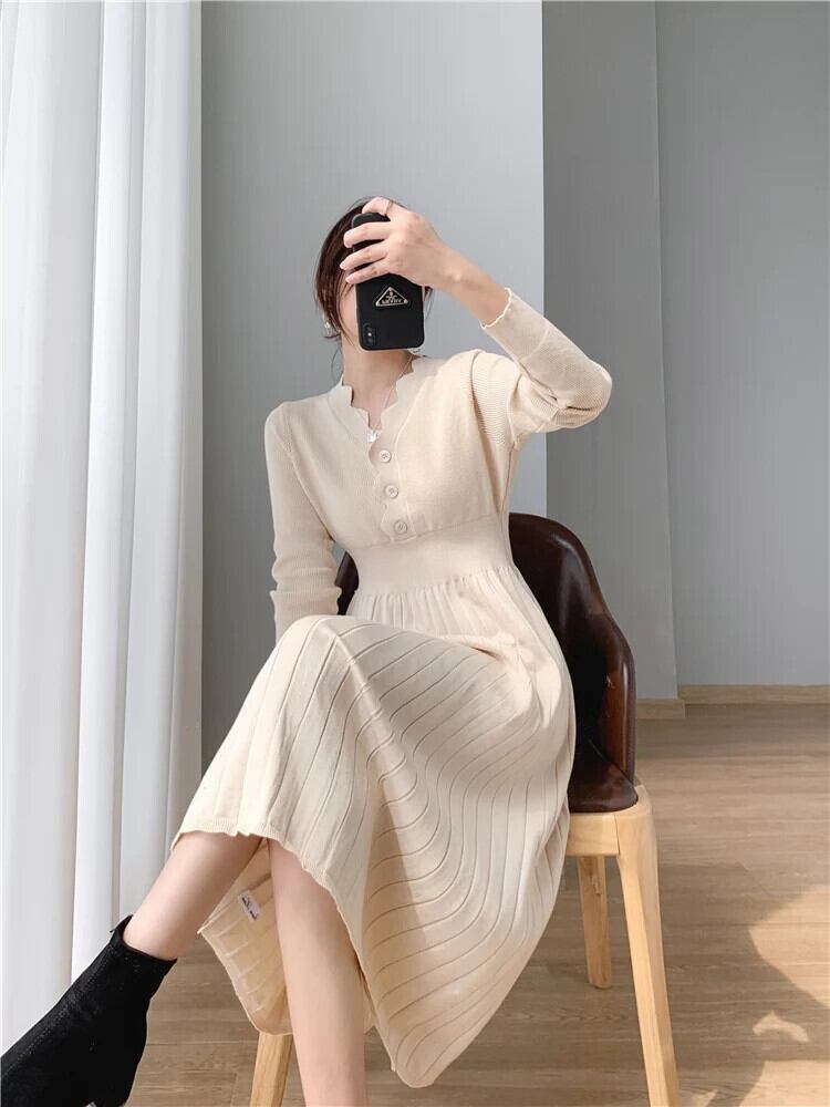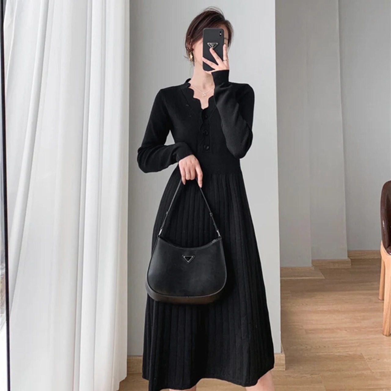 送料無料 プリーツドレス女性長袖女性セーターニットドレススカートミディドレスベージュ黒秋 2023 ロング ブラック オータム 秋物 AE008878720463009397 | 女性の為の通販サイト-fashion navi