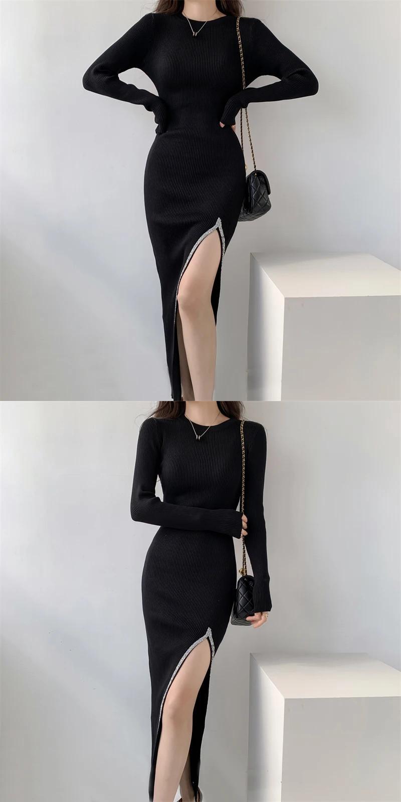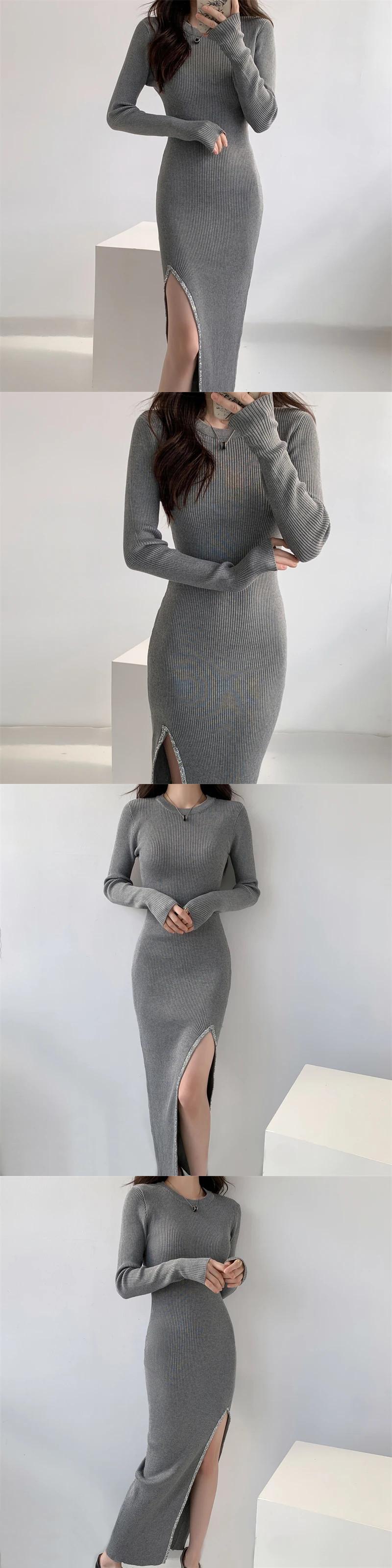 送料無料 長袖ボディコンセクシーなニットマキシドレス女性のセータードレスサイドスリットスリム秋冬 2023 ドレス ロング オータム 秋物 ウィンター 冬物 AE008878752425787651