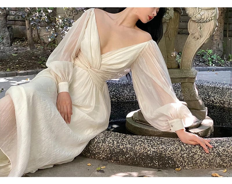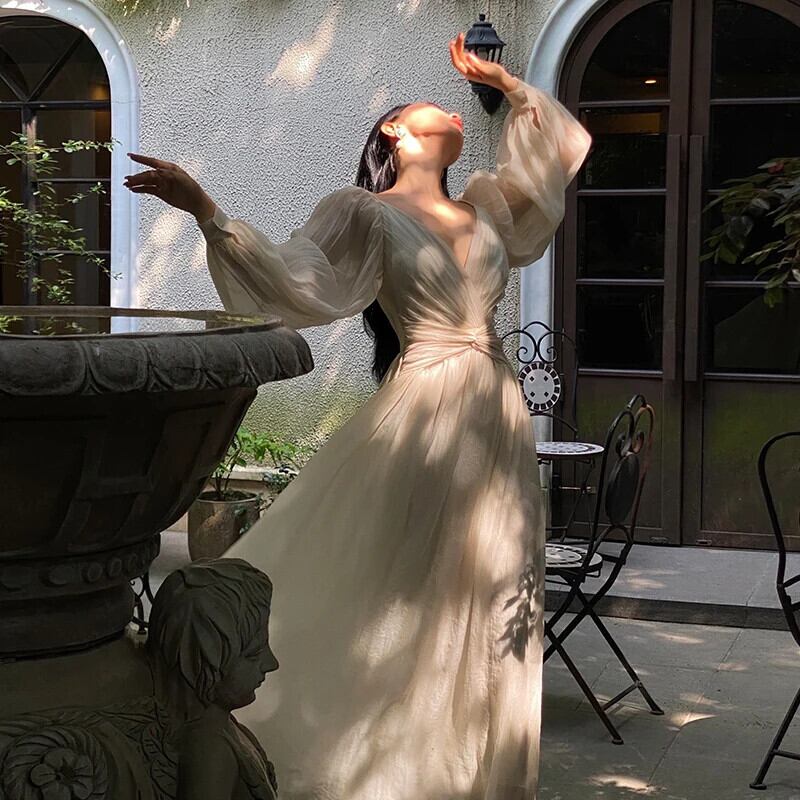 送料無料 ヴィンテージ V ネックプリーツマキシドレス女性パーティーフリンジレースパフスリーブフリルレディドレス夏 サマー 夏物 Vネック ビンテージ AE008878736983392983