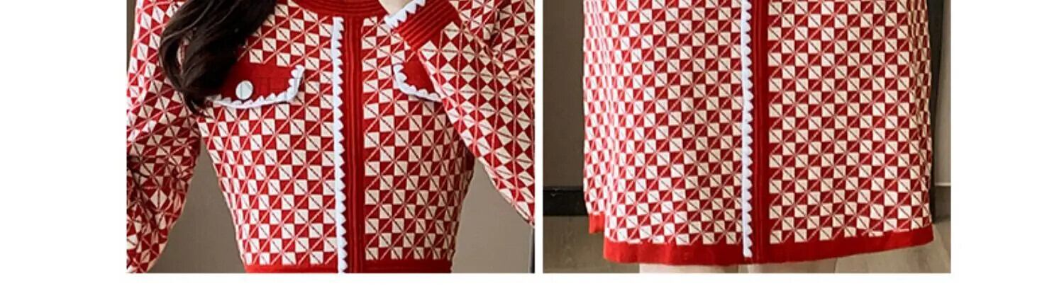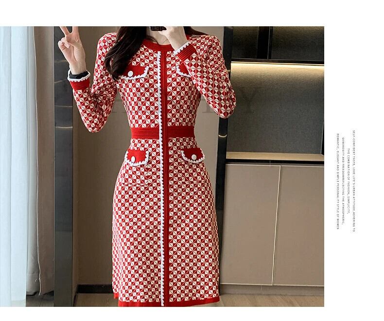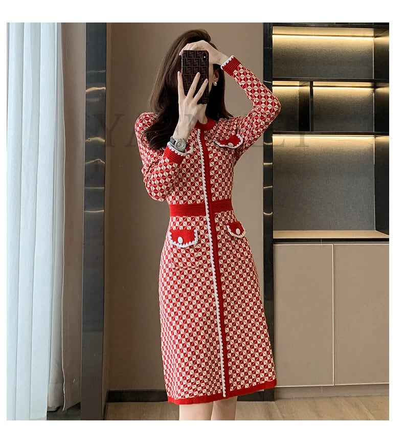 送料無料 ヴィンテージプルオーバーニットセーター膝ドレス女性ポケット O ネックチェック柄赤ドレスローブ Vestidos 秋 レッド オータム 秋物 Oネック ビンテージ AE008878731397524343