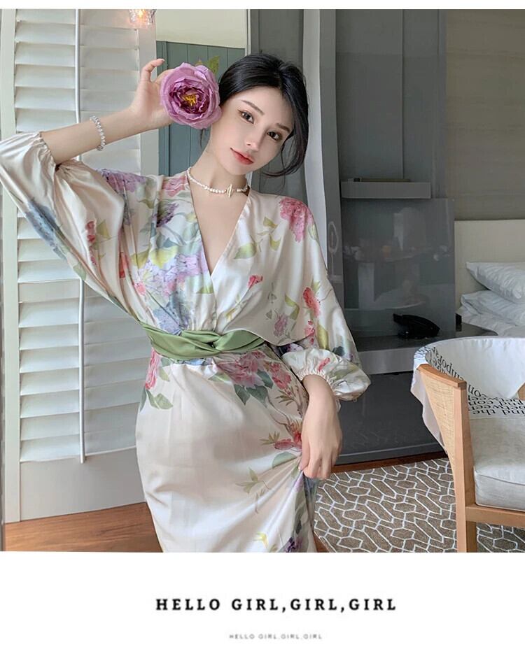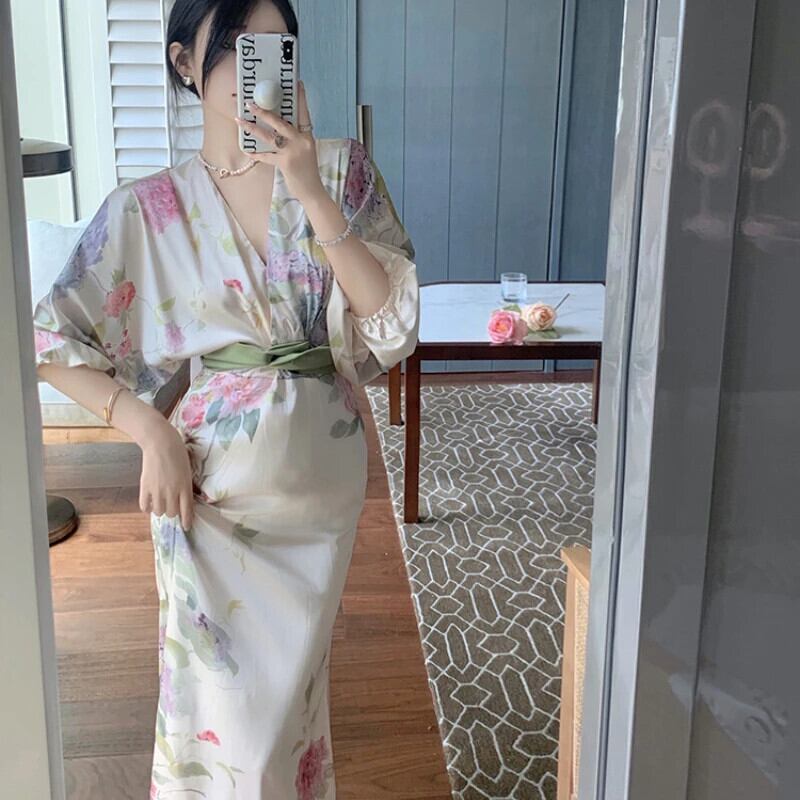 送料無料 印刷ミディボディコンドレススタイル V ネックロングハーフバットウィングスリーブサッシ花マキシドレスの女性の夏 2023 サマー 夏物 花柄 Vネック AE008878771828641842
