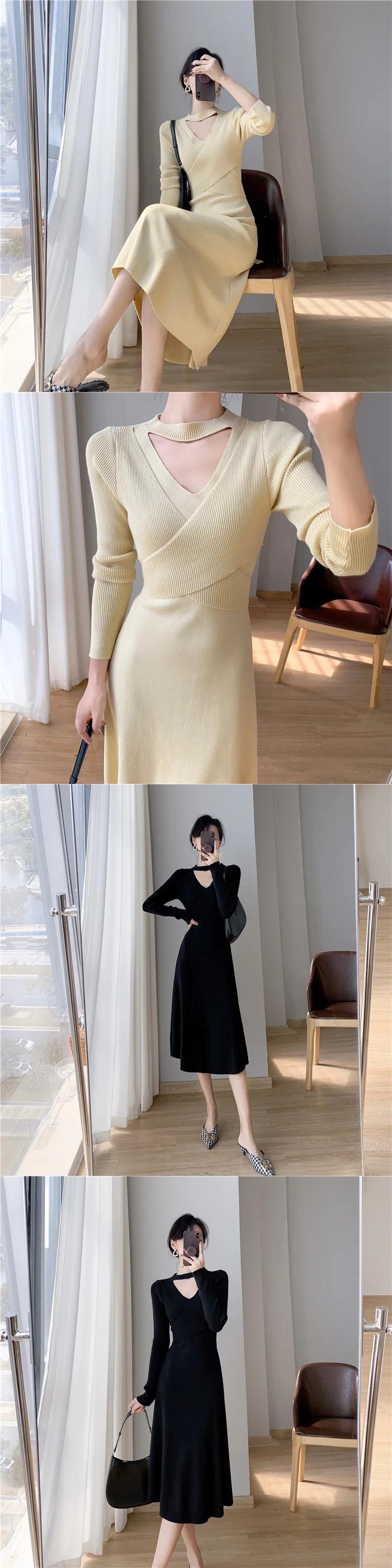 送料無料 ニットミディドレスの女性長袖フレンチスタイルボディコンドレススリムソリッド恋人ネック 2023 秋冬 ロング 大人ガーリー スウィート キュート カジュアル オータム 秋物 ウィンター 冬物 ソリッドカラー AE008878772869372627