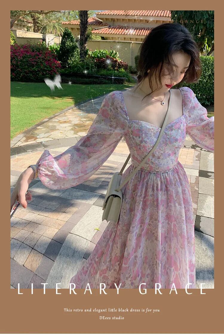 送料無料 ヴィンテージ長袖ワンピースシフォンドレス女性妖精 Elegnat フレンチ花パーティーミディドレスイブニング 2023 夏 ロング サマー 夏物 花柄 ビンテージ AE008878784257380554