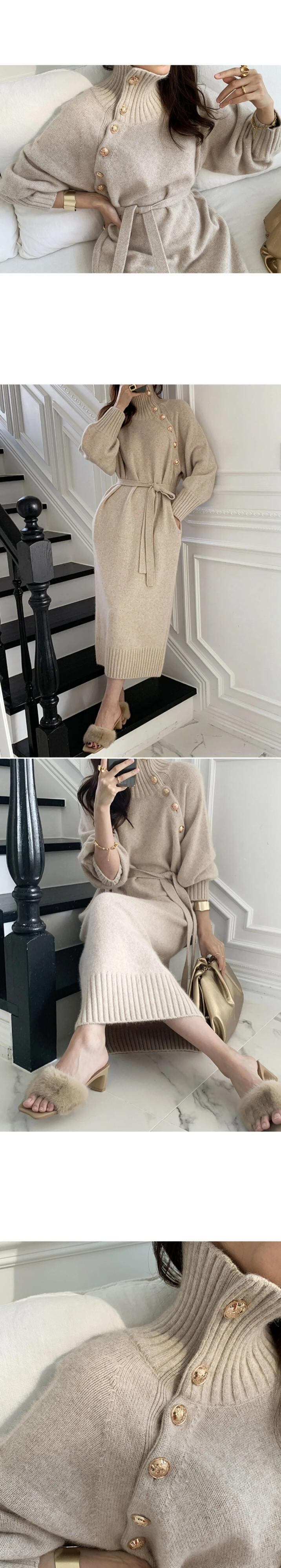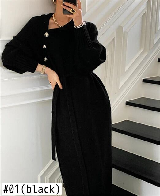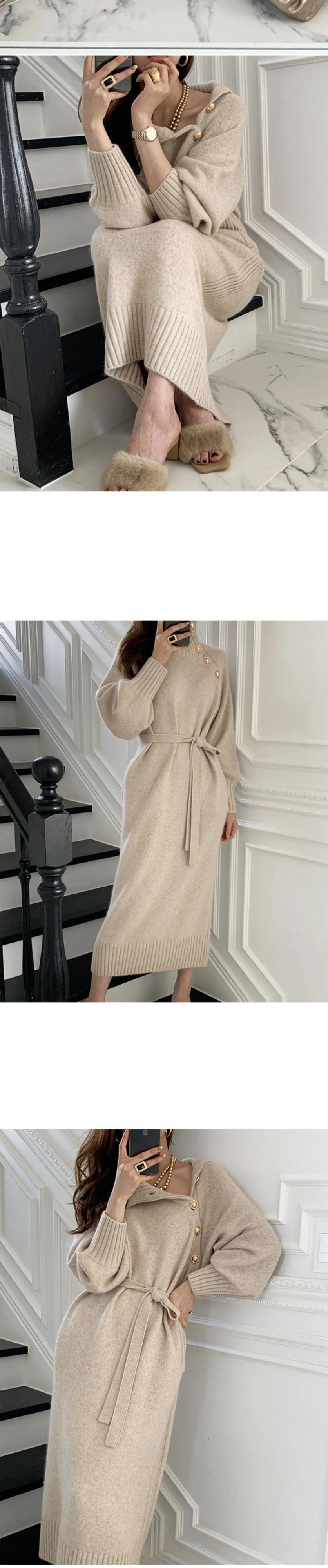 送料無料 冬のタートルネックボタン女性ニットドレスフルスリーブレースアップ厚みのロングドレスセーター秋 2022 オータム 秋物 ウィンター 冬物 AE008878793760740557