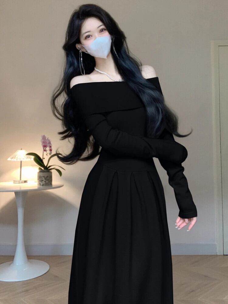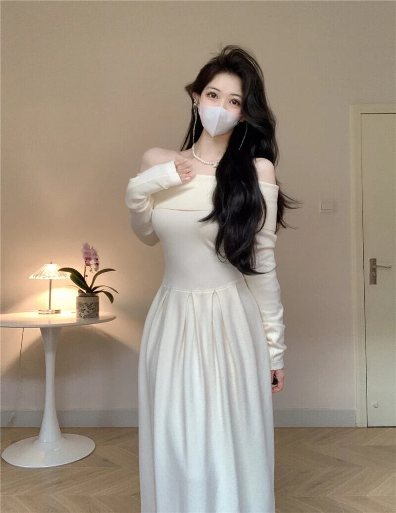 送料無料 ヴィンテージセクシーなスラッシュネックミディドレス女性シックなソリッドストライプ長袖ニットセータードレス暖かい冬 ロング ウィンター 冬物 ソリッドカラー ビンテージ AE008878712428330622