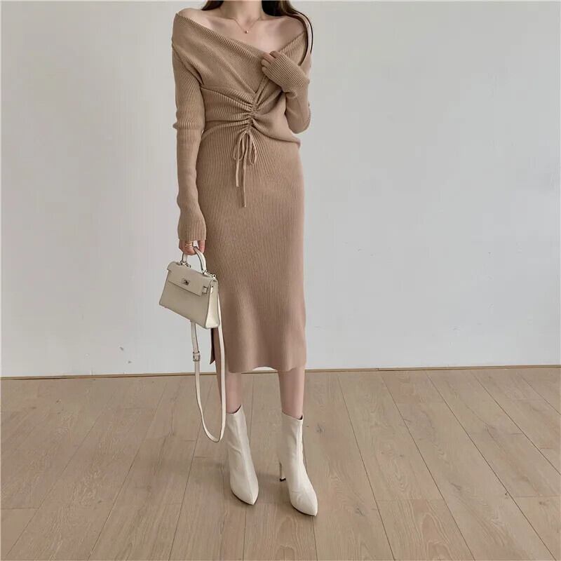送料無料 原宿ヴィンテージワンピースセーターマキシドレス女性ドローストリングボディコンスリムニット女性女性ドレス秋 2022 かわいい オータム 秋物 ビンテージ AE008878778987099394