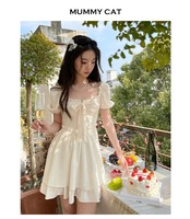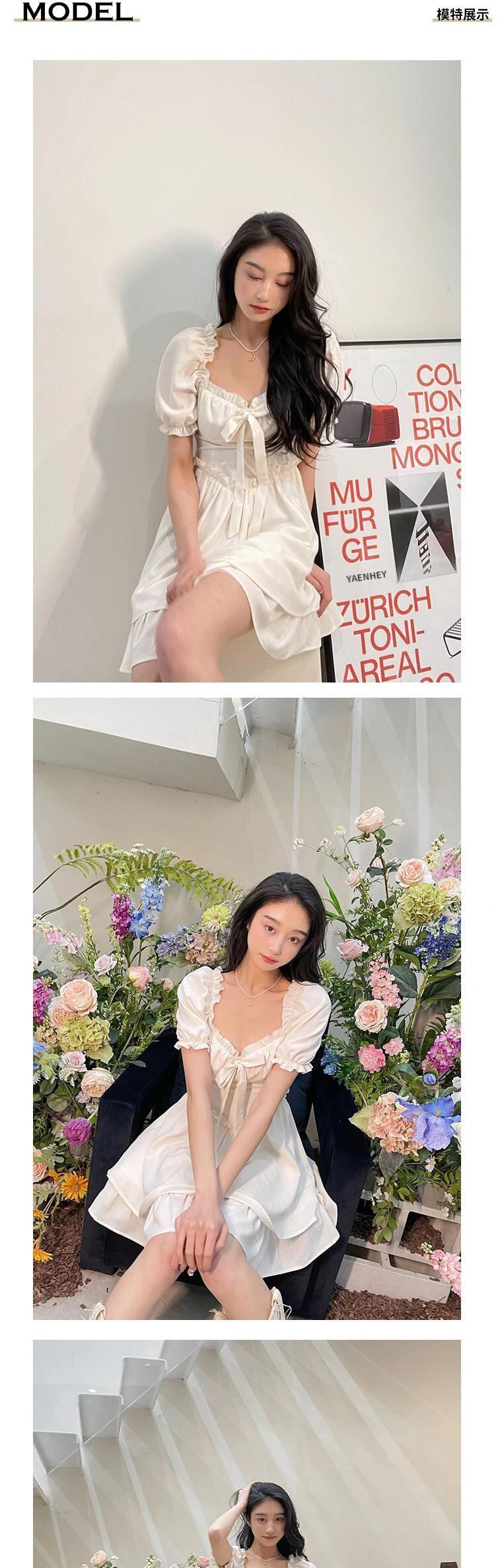 送料無料 ヴィンテージ甘い A ラインボウスクエアカラーショートパフスリーブミニイブニングマキシドレス女性パーティー夏 2023 リボン 大人ガーリー スウィート キュート カジュアル サマー 夏物 Aライン スクウェア ビンテージ AE00887871957047271