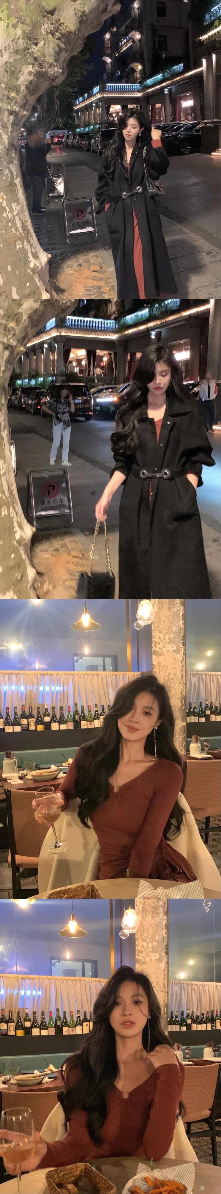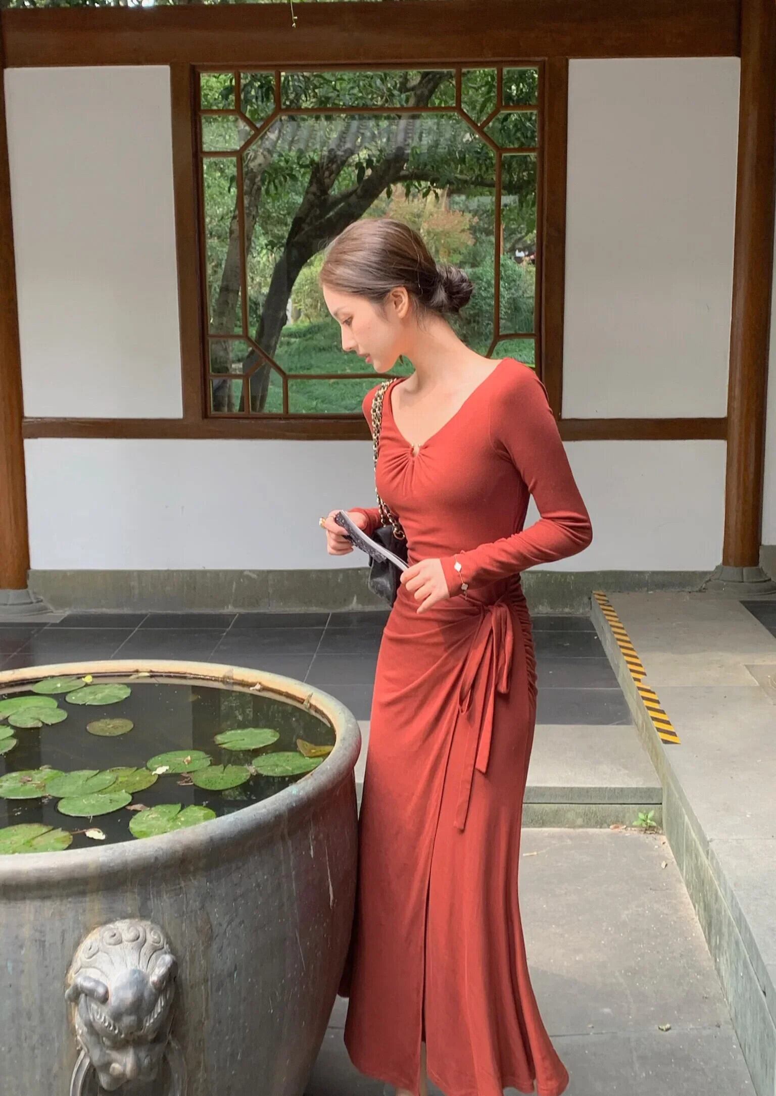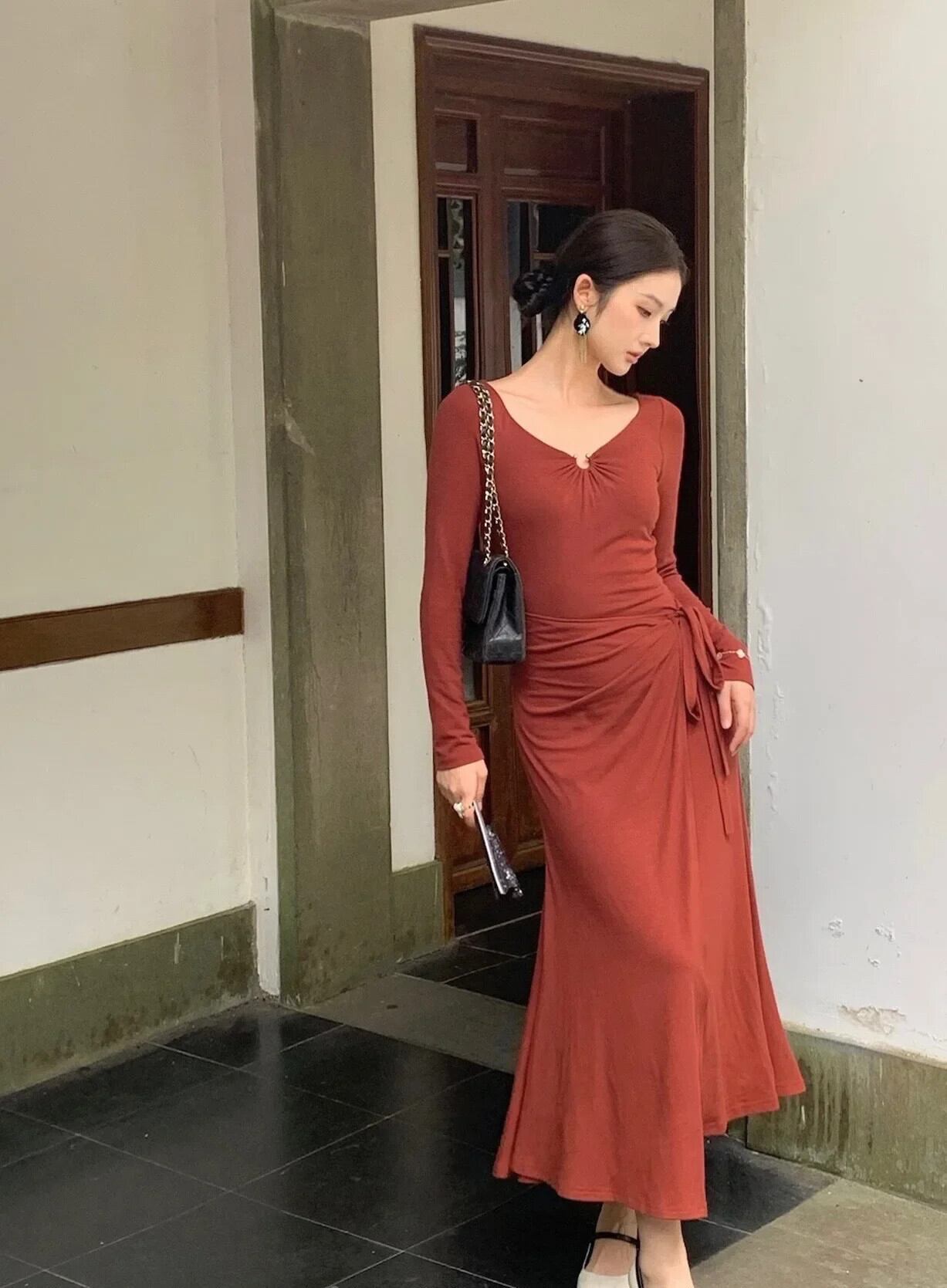 送料無料 ヴィンテージパーティー V ネックドローストリングミディドレス女性長袖誕生日ボディコンドレスローブ春 2024 ロング スプリング 春物 Vネック ビンテージ AE008878744290916370