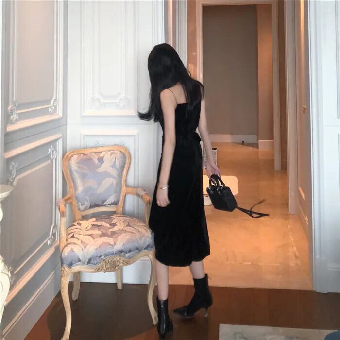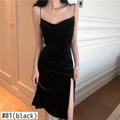 送料無料 2022 ヴィンテージ女性ドレススパゲッティストラップスリットベルベットブラックドレスセクシーなボディコン包帯ドレスミディパーティードレス Verano Vestidos ビンテージ AE00887875413384884
