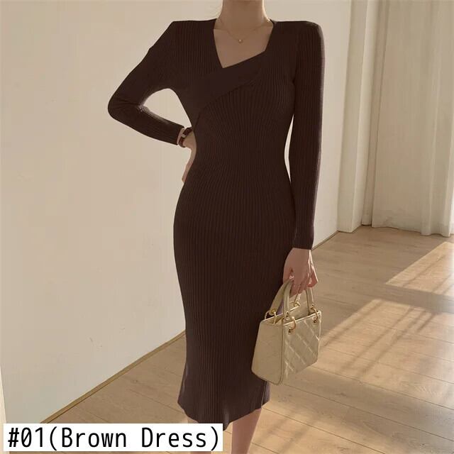 送料無料 ニット女性ラップスリムボディコンドレス斜め襟長袖シースニットオフィスミディドレス秋冬 2022 ロング オータム 秋物 ウィンター 冬物 会社 学校 通勤や通学にも AE008878726681669634