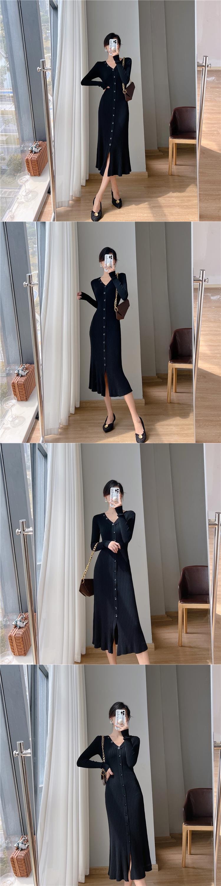 送料無料 V ネック長袖ボタンニットドレス女性スリムフィットセーターイブニングミディボディコンドレス冬秋 ロング オータム 秋物 ウィンター 冬物 Vネック AE008878768843526597 | 女性の為の通販サイト-fashion navi