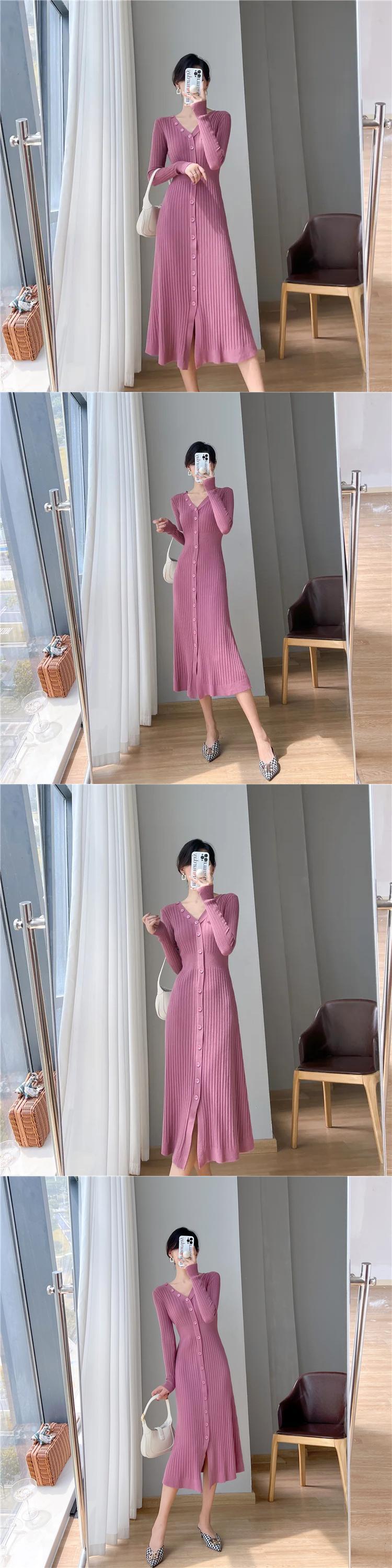 送料無料 V ネック長袖ボタンニットドレス女性スリムフィットセーターイブニングミディボディコンドレス冬秋 ロング オータム 秋物 ウィンター 冬物 Vネック AE008878768843526597