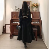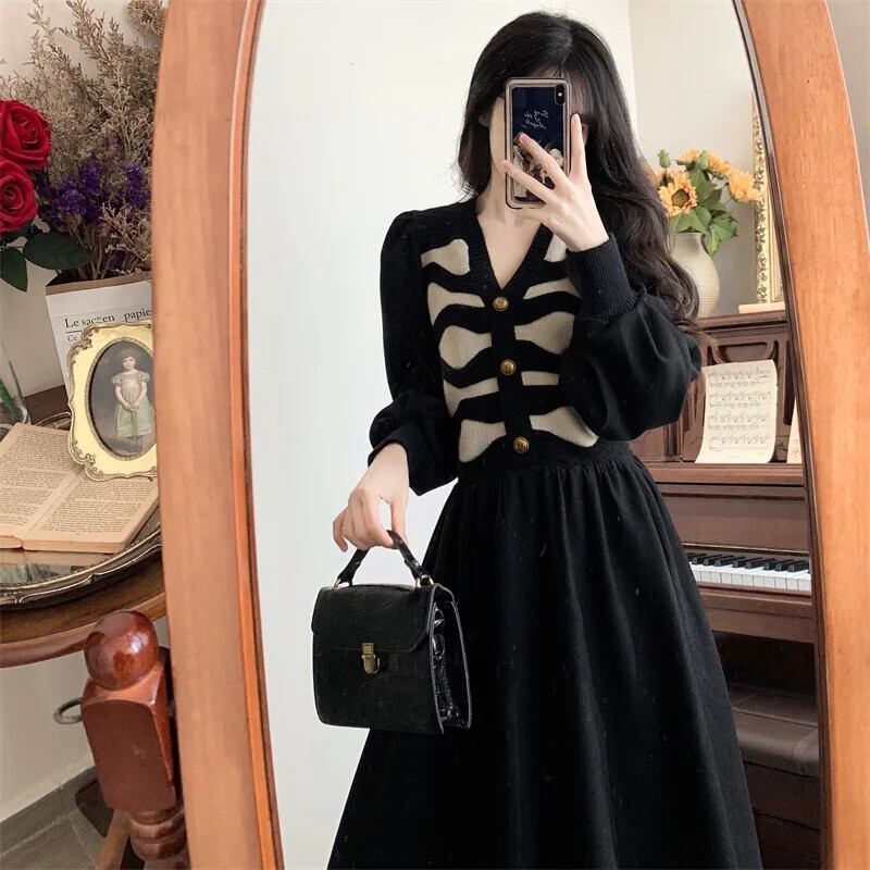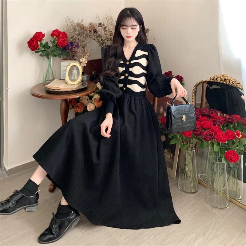 送料無料 偽二枚ニットコーデュロイパッチワークドレス女性ランタン長袖ドレス冬 2023 暖かい ロング ウィンター 冬物 AE008878712068609908