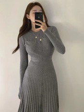送料無料 ヴィンテージニットミディドレス女性ボタンニットセータードレスプリーツ秋冬 2022 オータム 秋物 ウィンター 冬物 ビンテージ AE008878737655466154