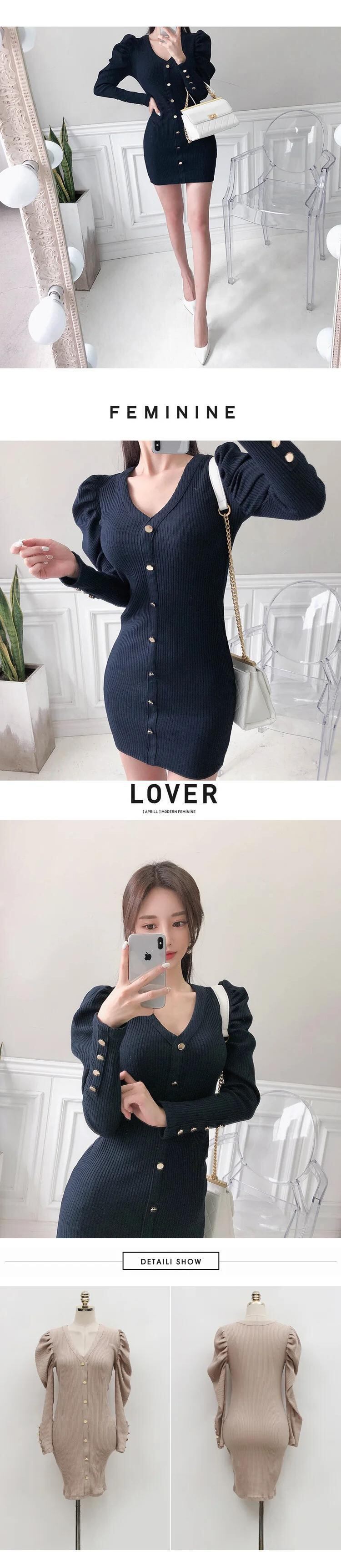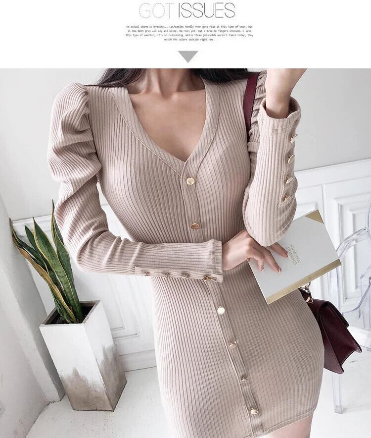 送料無料 ヴィンテージセクシーな V ネックパフスリーブニットセータードレス女性ボタン長袖ミニボディコンドレスイブニング秋冬 2022 ロング オータム 秋物 ウィンター 冬物 Vネック ビンテージ AE008878767580402158