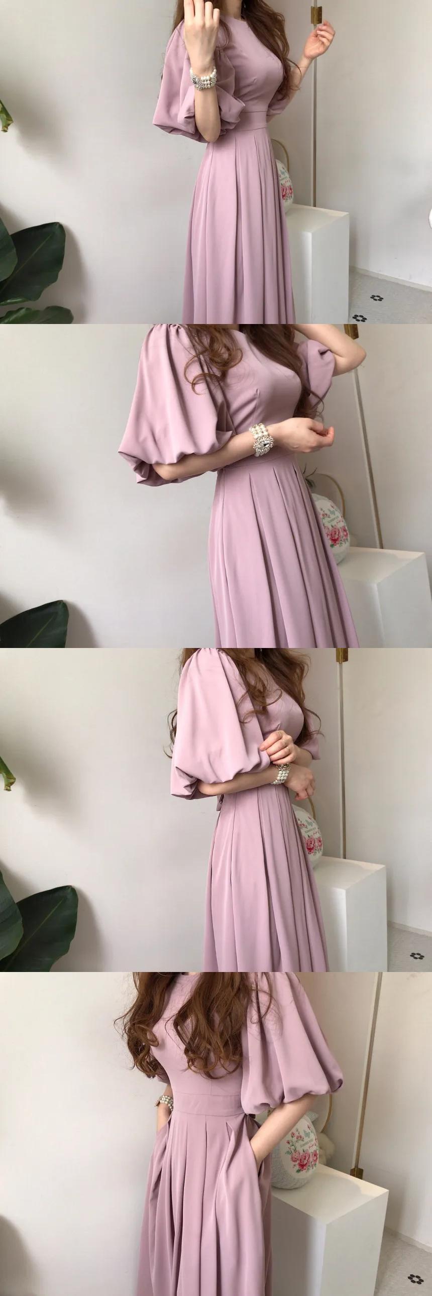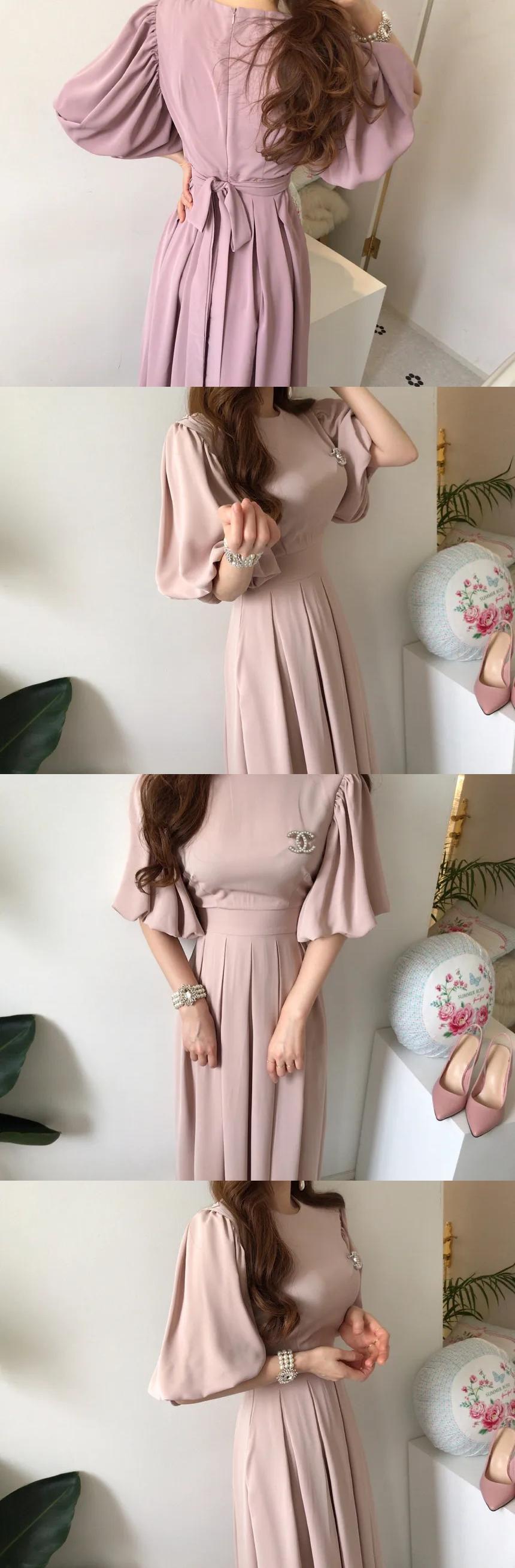 送料無料 固体シックなドレスの女性のウエスト O ネックストラップショートランタンスリーブプリーツミディドレス夏 2023 サマー 夏物 Oネック ソリッドカラー AE00887871927075542
