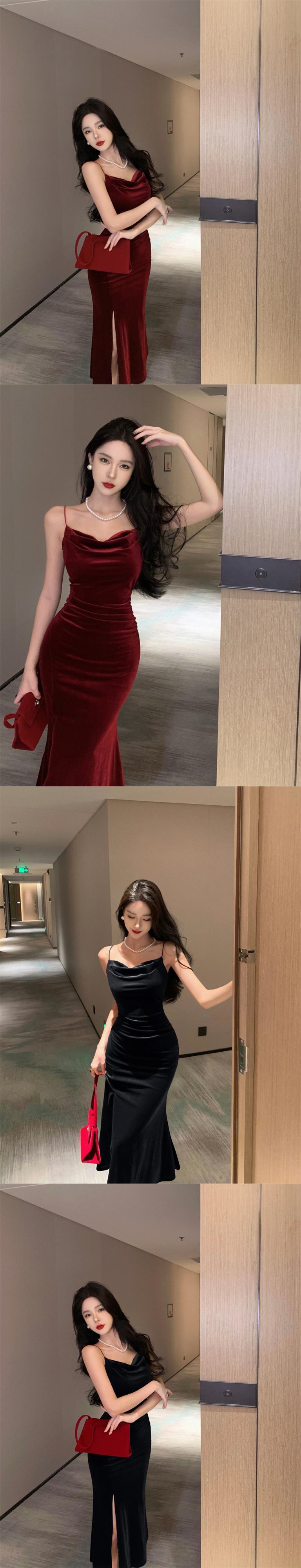 送料無料 ヴィンテージセクシーなクラブウエディングレッドドレス女性スパゲッティストラップスリットベルベットドレスビーチ包帯ボディコンミディドレスパーティー ビンテージ AE008878780224945909