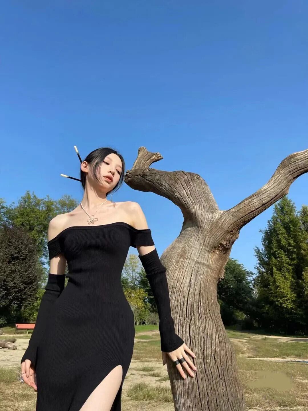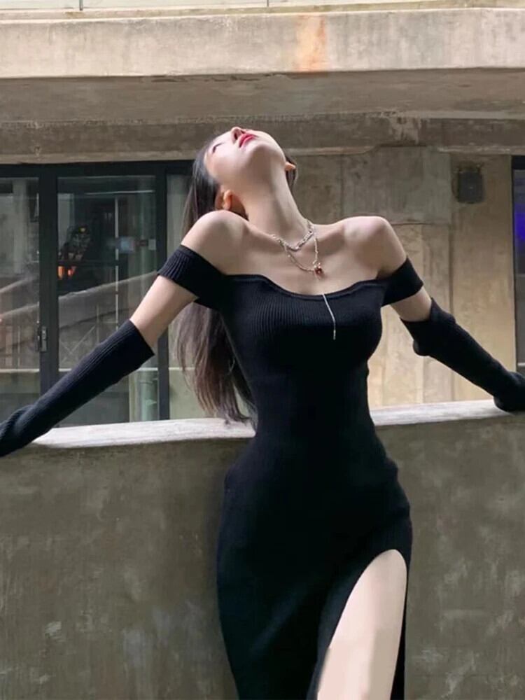 送料無料 原宿セクシーなシーススプリットオフショルダーニットドレス女性パーティークラブY2Kボディコン背中の開いた秋 かわいい オータム 秋物 AE008878739910982958